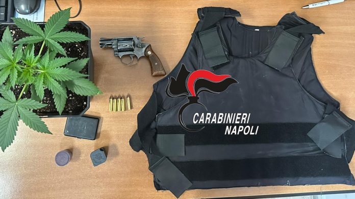 In casa una pistola a tamburo cal 38 con matricola abrasa, 10 proiettili dello stesso calibro, un giubbotto antiproiettile, 29 grammi circa di hashish e materiale per confezionare droga.