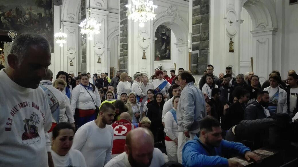 Nonostante i seri problemi di ordine pubblico e le difficoltà a governare il caos creato dalla folla, il fulcro pulsante del pellegrinaggio rimane la fede per la Mamma dell’Arco, l’attesa dei fujenti per varcare il portone della chiesa dove si prostreranno dinanzi all’altare. In molti svengono, sono preda delle convulsioni e hanno necessità di soccorso immediatamente prestato dalla schiera dei volontari di Croce Rossa e Protezione Civile. Il Santuario è aperto dalle tre del mattino a mezzanotte, si potrà accedervi soltanto dalla porta centrale e le squadre dei battenti, rigorosamente in divisa, faranno il loro ingresso da via Arco (lato Sant’Anastasia e lato Napoli) a turni alterni, mentre i civili potranno entrarvi da via Sorrentino ogni ora. Rigorosamente vietato l’accesso in chiesa a toselli, statue, bande musicali e strumenti, proibite foto e riprese anche con i telefonini senza l’autorizzazione del Rettore. Da sottolineare, in attesa del momento clou che vedrà le squadre di fujenti entrare in Santuario per rendere omaggio alla Mamma dell’Arco, l’appello che il rettore padre Alessio Romano ha voluto mettere per iscritto: «È assolutamente vietato uscire per le strade in divisa, con bande e stendardi, e fare questue per i centri cittadini – dice il priore domenicano – tutto quello che accade nei gruppi che fanno riferimento alla Diocesi di Napoli non è di nostra competenza e non costituisce per nessuno un valido motivo per non assumere comportamenti corretti, rispettosi e di buon esempio». C’è come di consueto un sottile limite, per chi assiste alle scene di omaggio alla «Mamma dell’Arco» nel Santuario, tra sacro e profano. La Madonna dell’Arco è quella del popolo, i suoi figli si rivolgono a Lei come parlerebbero alla mamma, appunto. Fuori dalle cinte del Santuario è tutta un’altra storia. Un caos indicibile tra bancarelle delle quali molte abusive, con la musica dei neomelodici a volume insostenibile, banchi con animali in gabbia, una coltre di fumo e olio bruciato che avvolge l’intera cittadella Mariana sollevandosi dai banchetti dei rivenditori ambulanti di panini. I residenti sono, per un giorno intero, «ostaggio» della Festa ma i commercianti locali preferiscono chiudere, ormai da molti anni, le serrande. La fede rimane nel Santuario, fuori da quel portone soltanto un’anarchica fiera.