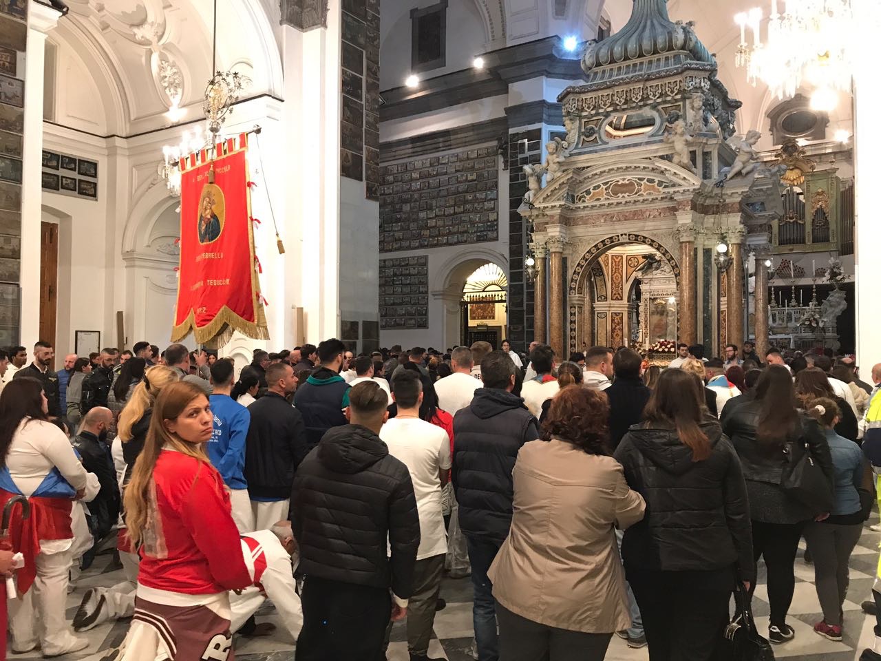 Molte migliaia di «battenti», altrettanti pellegrini che sono arrivati già alle prime luci dell’alba per il consueto pellegrinaggio alla Madonna dell’Arco. Il portone del Santuario di Madonna dell’Arco si è aperto alle 3 del mattino per accogliere le squadre di fujenti in arrivo da Napoli, dalla provincia, da molti paesi della Campania e oltre. Nel 2016 arrivarono a Madonna dell’Arco più di 360mila persone, altrettante sono le presenze previste per oggi, un afflusso che mette seriamente a rischio l’ordine pubblico e la sicurezza garantita solo, negli ultimi anni, da poche decine di carabinieri, poliziotti e vigili urbani con l’ausilio della protezione civile.