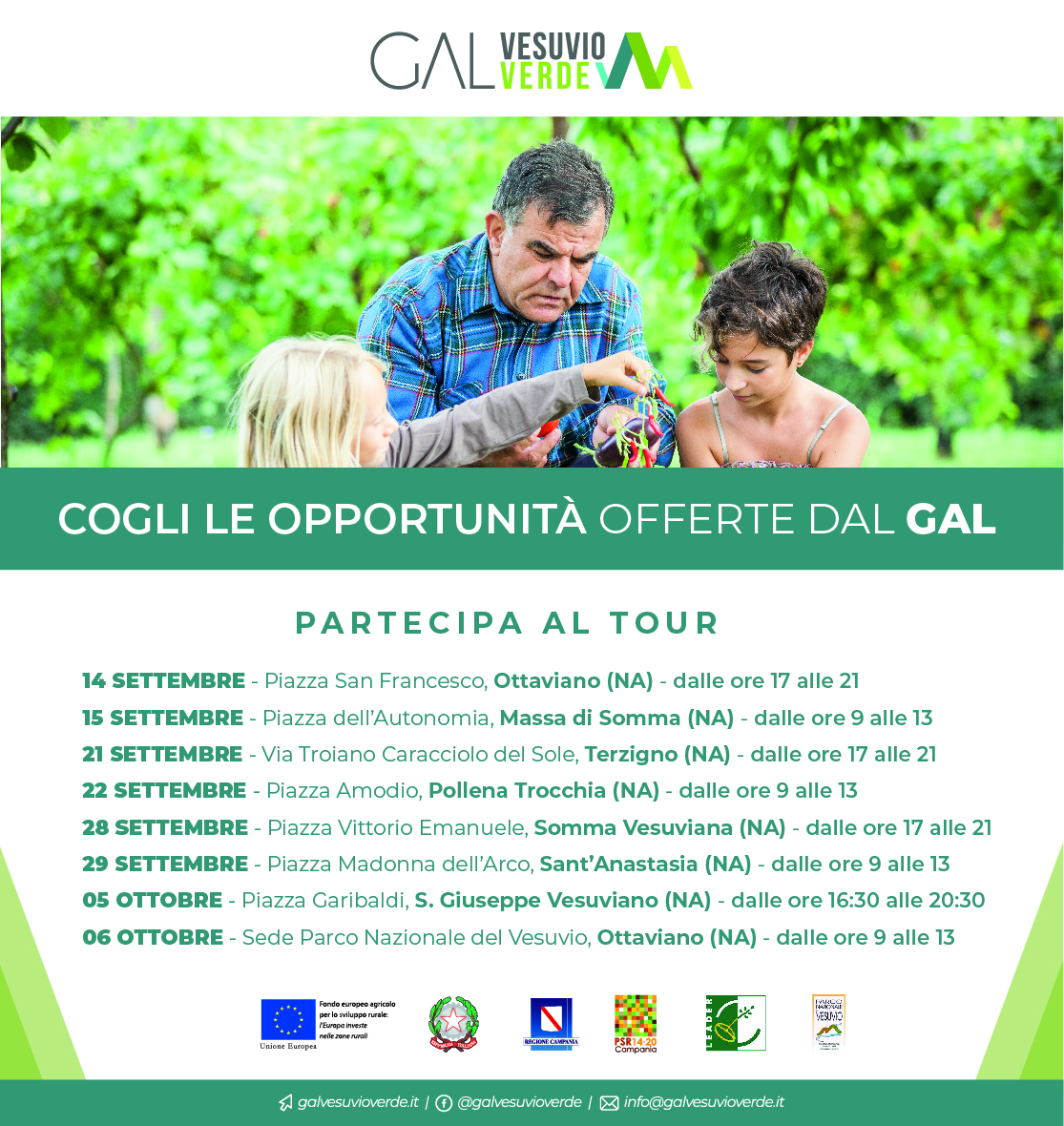 Il GAL Vesuvio Verde prevede una serie di appuntamenti di carattere informativo nelle piazze dei comuni del gruppo di azione locale (Ottaviano, Terzigno, Sant’Anastasia, San Giuseppe Vesuviano, Massa di Somma, Somma Vesuviana, Pollena Trocchia) e al Palazzo Mediceo di Ottaviano, sede dell’Ente Parco Nazionale del Vesuvio, capofila del consorzio pubblico-privato. Gli eventi itineranti, coadiuvati dalla presenza di un bus destinato all’accoglienza degli utenti interessati ai temi divulgati nel corso delle iniziative, hanno lo scopo di: