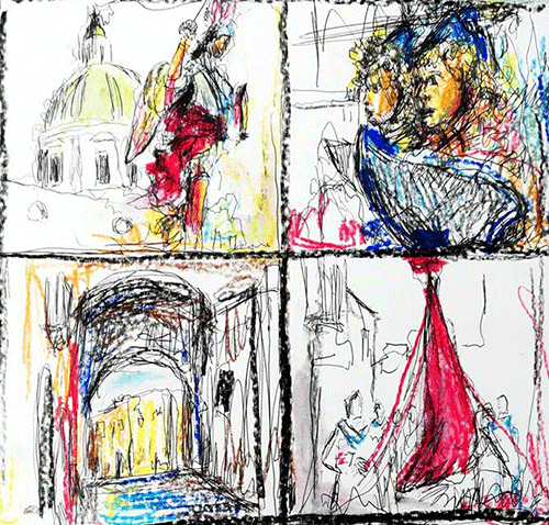 Il sapore delle “carcioffole arrustute” mi piace definirlo “’nziriuso” e arricciato. Arricciato, perché quel tono amaro lo percorre tutto, dalle foglie al cuore, senza tregua, pur variando l’intensità: è un tono caparbio, come devono essere la pazienza, la ricerca della conoscenza, e la seduzione. In lingua napoletana “’nziriuso” non significa solo “capriccioso”, significa anche “ caparbio, ostinato”. In questo senso “’nziriosa” è la penna di Ciro Giaquinto, notevole artista ottavianese, che “tormenta” il colore con la calcolata tensione dei fasci di linee, e crea, con questa tecnica, un suggestivo contrasto tra la quiete e il moto, tra la luce e l’ombra, tra il presente immediato dello sguardo e il fascino del ricordo. I suoi disegni, che corredano l’articolo, sono un omaggio al Patrono di Ottaviano, e, nello stesso tempo, uno splendido documento di arte “’nziriosa”: di arte ispirata, rigorosamente sicura di sé, e perciò anche un poco capricciosa.