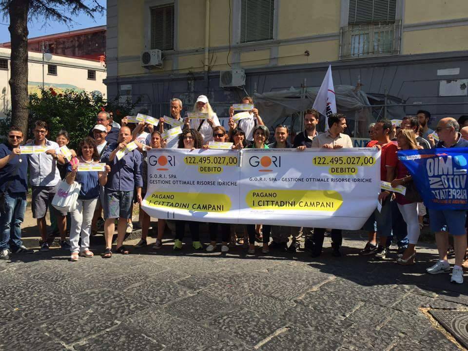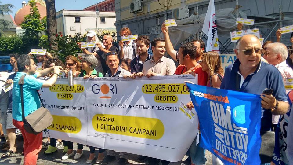 ” Gori: 122 milioni di debiti. Sono i debiti che pagheremo noi “, lo hanno scritto su uno striscione a forma di maxi bolletta i militanti del Movimento Cinque Stelle, che ieri mattina hanno formato un presidio davanti al palazzo della società presieduta dall’onorevole di Forza Italia Amedeo Laboccetta. A un certo punto i parlamentari pentastellati Gallo e Sibilia hanno distrutto simbolicamente una richiesta di pagamento dell’azienda. Intanto anche il consigliere regionale di Davvero Verdi si scaglia contro l’impresa che con i suoi 700 dipendenti grava in maniera formidabile sulle tasche del milione e mezzo di abitanti che usufruiscono del servizio idrico molto carente fornito da quest’azienda ( basti pensare ai continui black out idrici che flagellano da anni ad esempio i comuni vesuviani ). Il M5S chiede ” la procedura di urgenza per l’approvazione della legge regionale sull’ acqua pubblica scritta da cittadini, comitati pro acqua pubblica e associazioni dopo le dimissioni di Carlo Sarro da commissario dell’Ato3, coinvolto nell’inchiesta su appalti truccati e camorra e ” la restituzione dei poteri decisionali di gestione dei servizi idrici ai sindaci dei comuni vesuviani e sarnesi così come richiesto dai comitati dell’acqua e dalla rete dei sindaci per l’acqua pubblica “. Luigi Gallo aggiunge che ” L’obiettivo è approvare una legge regionale che ridia potere agli organi democraticamente eletti, i sindaci, che devono decidere davanti ai cittadini a chi affidare la gestione dei servizi idrici. Il gestore per il M5S resta pubblico perché è l’unico che permette il controllo reale dei cittadini su bilanci, appalti, dirigenti, dipendenti “. Per Gallo vanno annullate le delibere sulla riscossione delle partite pregresse ovvero i recuperi tariffari, relativi agli anni 2006 – 2011, che si sono accumulati nel tempo a causa dell’inadeguatezza delle tariffe deliberate in passato dall’assemblea dell’ente d’ambito sarnese vesuviano. Carlo Sibilia aggiunge poi che ” l’acqua non può essere gestita da un commissario ” ma che ” deve tornare in mano ai sindaci e soprattutto deve uscire dalla concessione di spa. Inoltre, chiederemo in Regione di avere l’attuazione del referendum del 2011 “.