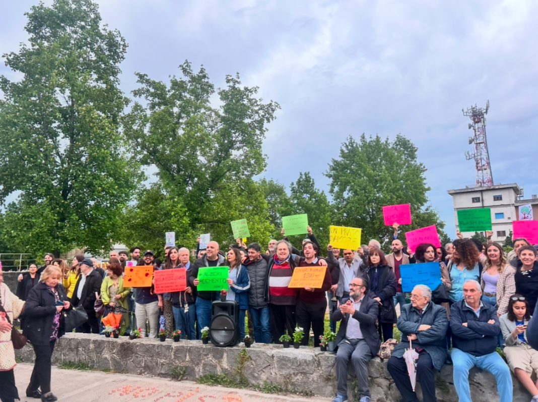 I partecipanti hanno portato come simbolo delle piantine e delle candele da porre sulla cosiddetta “lapide” e dei cartelloni i quali sono stati posti intorno alla piattaforma.