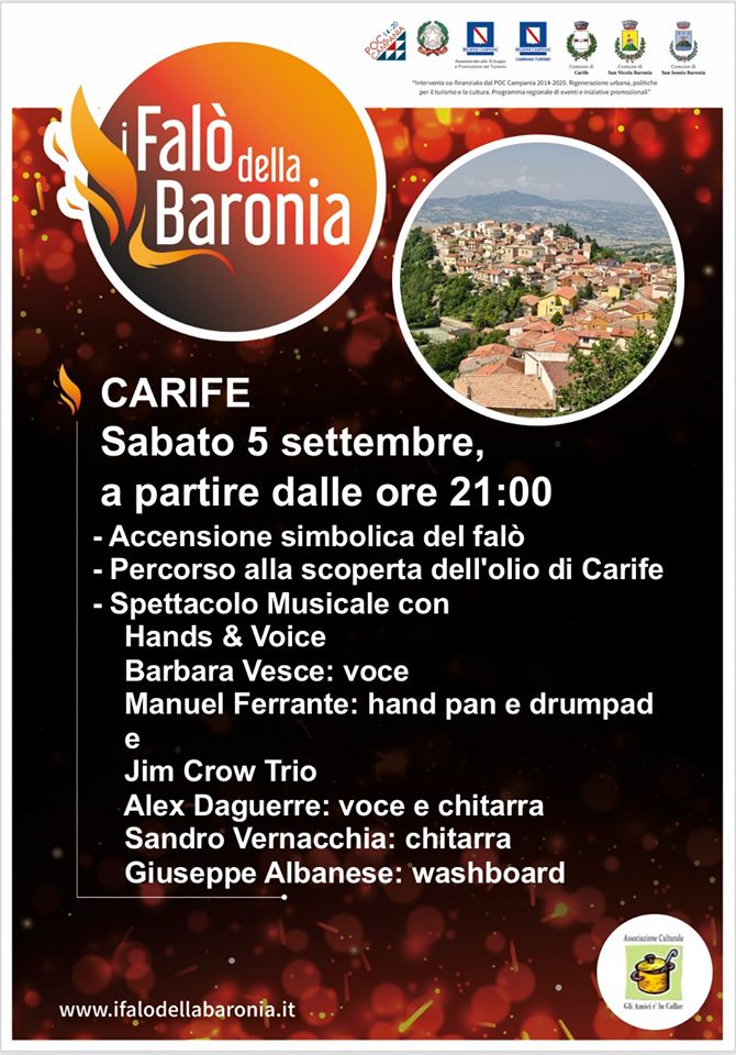 Il progetto “I falò della Baronia”, promosso dal Comune di Carife (AV), in partenariato con i comuni di San Nicola Baronia e San Sossio Baronia e co-finanziato dal POC Campania 2014-2020. “Rigenerazione urbana, politiche per il turismo e la cultura. Programma regionale di eventi e iniziative promozionali”, si chiuderà, con il suo ultimo appuntamento, sabato 5 settembre, proprio presso il Comune di Carife, capofila dell’iniziativa, in Piazza San Giovanni. L’evento riprenderà simbolicamente la tradizione del Falò di San Giuseppe, il cui svolgimento, previsto come da consuetudine per il 19 marzo, è stato impedito a causa dell’emergenza sanitaria nazionale da COVID-19. Si comincia alle ore 21,00, con l’accensione simbolica del falò e il doppio spettacolo musicale con gli “Hands & Voice” Barbara Vesce alla voce e Manuel Ferrante all’hand pan e drumpad e il “Jim Crow Trio”, con Alex Daguerre alla voce e chitarra, Sandro Vernacchia alla chitarra e Giuseppe Albanese al washboard.