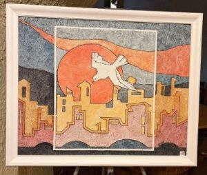 E così, nel quadro la cui immagine correda l’articolo, il dettaglio fondamentale è il “movimento” del verde che trasmette la sua vitalità alle rocce brulle e alla tenue velatura di celeste di cui l’artista si è servito per dipingere un mare stanco e, direi, spento. Dino Miele e Antonio Amato conoscono le sperimentazioni post-cubiste e “neoplastiche” di Mondrian, di Gino Severini e di Carlo Carrà: ma proprio come accade nei quadri di questi tre Maestri i due artisti ottavianesi fanno emergere dal mosaico di forme geometriche figure compiute che diventano un sostanzioso richiamo alla realtà: lo strumento musicale nel quadro di Dino Miele (immagine in appendice), la colomba in volo nell’opera di Antonio Amato (immagine in appendice).