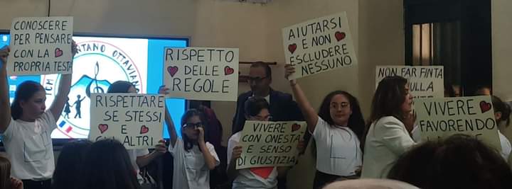 Nel pomeriggio i ragazzi dell’“I.S. Domenico Beneventano” hanno celebrato, in molti modi, l’eroe di cui la Scuola porta il nome:con brevi discorsi, con cartelli “segnati” da parole cariche di significato (vedi immagine in appendice), ricordando che il seme della giustizia nemmeno la violenza può renderlo sterile, leggendo qualche poesia di Mimmo. I ragazzi della “Beneventano” e quelli che rappresentavano altre scuole di Ottaviano hanno anche recitato una “scena” che ruotava intorno a uno di loro, chiamato a interpretare, vestito da medico, Mimmo, che era medico. I ragazzi hanno ascoltato con attenzione i discorsi della sorella di Mimmo, del sindaco di Ottaviano, dell’assessore alla Scuola, di altri politici, locali e regionali, e hanno sopportato anche il mio discorso, che è stato brevissimo, perché a Mimmo – l’ho detto a voce alta – non piacevano i fiumi di parole. Ma a Mimmo Beneventano la “sua” scuola ha reso l’omaggio più intenso e commovente con i brani musicali eseguiti dall’orchestra dei ragazzi dell’Istituto: e quelle note, svolgendosi armoniosamente nel silenzio incantato dei presenti, hanno trasmesso a tutti il “senso” prezioso di un ricordo che non solo non si spegne, ma diventa di giorno in giorno più profondo e apre, realmente, il cuore e l’intelletto degli studenti. I docenti tutti della scuola e la Dirigente prof.ssa Anna Fornaro meritano un sincero grazie.
