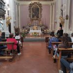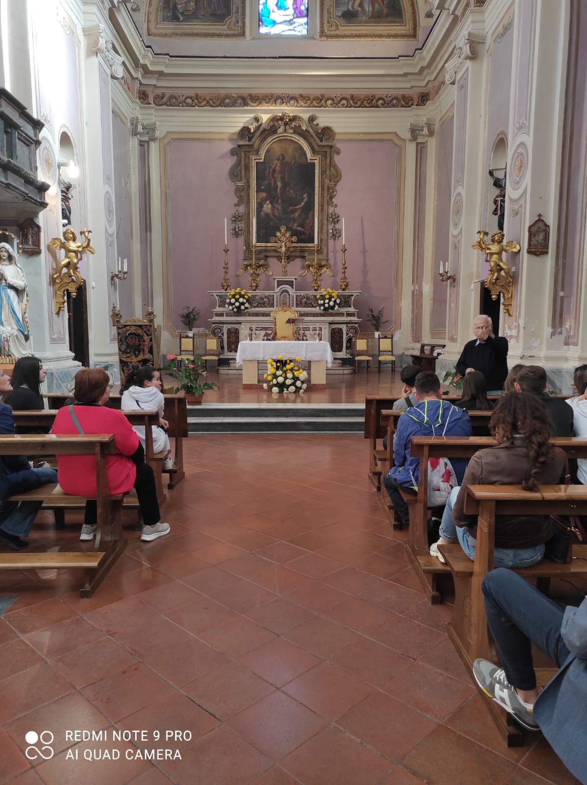 Ho scelto come “corredo” dell’articolo la foto della statua del “togato” romano che si vedeva, molti decenni fa, insieme a statue “sorelle” sul muro di cinta del Palazzo Medici: ed è un’immagine, che anche “in assenza”, parla ancora e ci spinge a ricordare, a porre domande, a rendere complessa la lettura della storia di Ottaviano. Aveva ragione Remo Bodei: le cose e le immagini hanno una loro vita, parlano, ci costringono ad ascoltare e a interrogarci. Nella Chiesa di San Giovanni (immagine in appendice) i ragazzi hanno appreso che il quadro dell’altare maggiore – il San Giovanni che predica alle turbe- è forse del De Matteis , sono stati sollecitati a notare la nuda spalla della donna “orante” nell’angolo in basso della tela- l’angolo di “ingresso” del nostro sguardo -, sono stati informati delle vicende di cui fu protagonista e “vittima” il telero del soffitto, il crollo nell’ottobre del 1929, l’incompetenza del restauratore Eberardo Perrone che rimontò male il telero, dopo averlo coperto con un marasma di pennellate. Hanno appreso, i ragazzi, che l’altare maggiore, del sec. XVII, era un raro esempio di altare di legno, dipinto in modo da sembrare di marmo: ma nel 1854 un architetto ottajanese rovinò il capolavoro, sostituendo il paliotto di legno con lastre di vero marmo. Hanno prestato attenzione, i ragazzi, alla “tensione” del “Cristo crocifisso” che nei primi anni del ‘600 la famiglia sarnese degli Scudieri donò alla chiesa, e hanno osservato i segni del sapiente restauro condotto da Umberto Maggio. La loro attenzione era stata accesa all’inizio della visita, quando avevano appreso che sotto il pavimento delle cappelle erano stati seppelliti, fino ai primi anni dell’’800, i “notabili”, mentre sotto i basoli della piazza avevano trovato sepoltura gli “umili”: e questo accadeva in tutte le chiese più importanti. Questo particolare i ragazzi non solo non l’hanno dimenticato subito, come spesso accade, ma è stato il filtro attraverso il quale hanno percepito tutte le altre immagini che ad essi sono state mostrate e commentate nella chiesa. E’ stata una preziosa esperienza. Accompagnavano i ragazzi le docenti Annamaria Napolitano, Stefania Di Lauro, Alexsandra Mauro, Autilia Arpaia e i docenti Savino Alaia e Salvatore Nappi. Merita un sincero “grazie” anche il Dirigente Vincenzo Falco, sapiente promotore di progetti.
