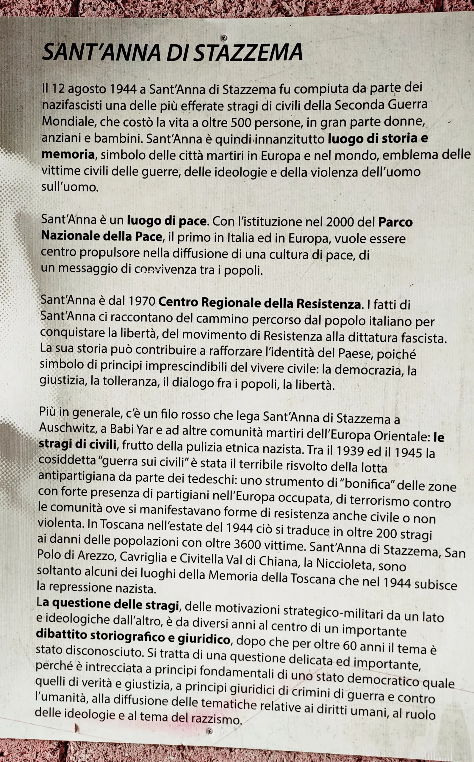Nonostante la distanza e il percorso poco agevole, al Sacrario e al villaggio di Sant’Anna di Stazzema andrebbero portati i nostri giovani studenti. Per il momento, grazie al nostro giornale online, possiamo raccontare le forti emozioni provate, documentando la visita anche con una nutrita galleria fotografica di scatti personali.