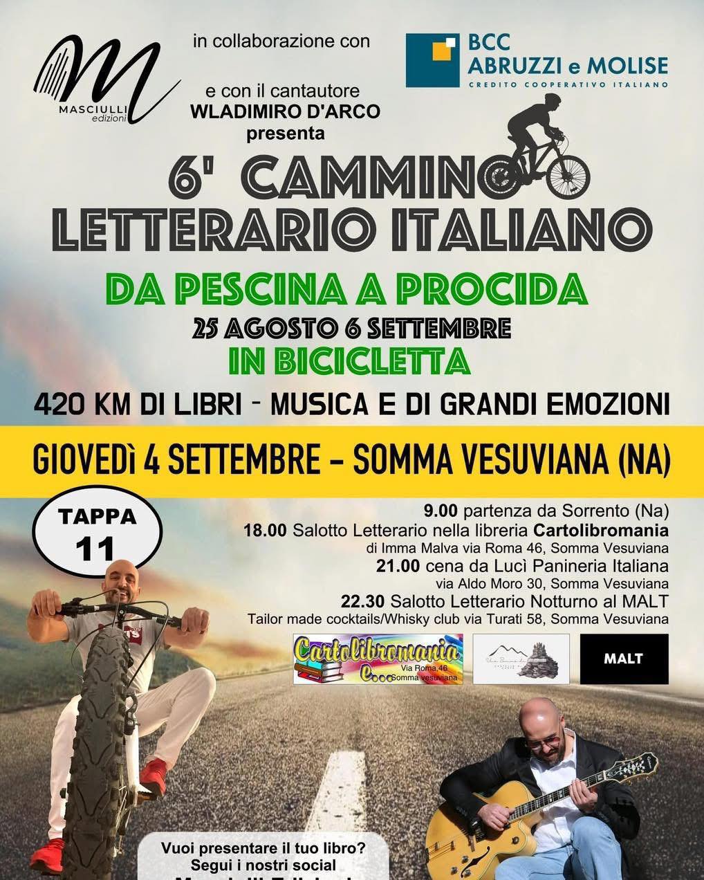 L’arrivo a Somma Vesuviana previsto per le 18:00 nel cortile dell’edificio comunale di Piazza Vittorio Emanuele sarà moderato dalla giornalista Sonia Sodano. Il programma della giornata del 4 settembre poi proseguirà con altri due momenti di incontro e convivialità alle ore 21.00 con una cena presso Luci Panineria Italiana (via Aldo Moro, 30 – Somma Vesuviana) e alle ore 22.30 al Salotto letterario notturno al MALT Tailor Made Cocktails/Whisky Club (via Turati, 58 – Somma Vesuviana).