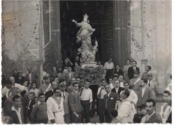 Anche il rito religioso dell’ Assunta diventa, alla fine, un momento di festa, come racconta, splendidamente, Matilde Serao in un suo romanzo: “non erano soltanto i ventimila abitanti” di Santa Maria di Capua “ che avevano lasciato le loro case, in quella sera di mezz’agosto, per assistere al grande fuoco d’artifizio in onore dell’ Assunzione di Maria Vergine: ma anche dai villaggi e dalle città vicine erano accorsi, per devozione e per curiosità… i conciatori di cuoio, gli ortolani di San Nicola la Strada, i setaiuoli di San Leucio, i fabbricanti di torroni di Casapulla, gli agricoltori di Maddaloni e di Aversa, le pallide maceratrici della canapa che languiscono un’intera stagione sulle sponde dei lagni.” Ricordo che anche a Ottajano don Pietro Capolongo, parroco di San Giovanni, un grande parroco che veniva da una terra di febbri, negli anni ’60 del secolo scorso fece sì che la festa dell’Assunta diventasse, con quella della Madonna del Carmine, il momento religioso più importante per la città, dopo la festa di San Michele: la fotografia, che apre l’articolo, e che da sola vale un lungo capitolo di storia ottajanese lo dimostra chiaramente. Anche il parroco don Luigi Pisanti, erede di Capolongo, dedicò all’ Assunta una cura particolare. Le carte mi dicono che il culto dell’Assunzione mise radici nella chiesa e nel quartiere di San Giovanni grazie a mons. Giosuè Maria Saggese, che in quel quartiere nacque il 15 maggio dell’’800, nel palazzo di famiglia: ancora oggi è il palazzo Saggese, dei Saggese “Matafone”. Il pio monsignore prima a Napoli e poi a Chieti, di cui divenne arcivescovo nel 1838, dimostrò una intensa devozione per il culto di Maria.