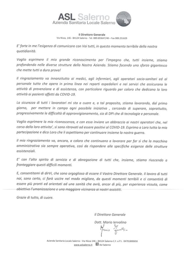 Non è una lettera di routine. Essa nasce dalla convinzione del dott. Iervolino che il sistema sanitario, essenziale tra i sistemi su cui si fonda l’organizzazione dello Stato democratico, funziona solo se è una squadra vera, in cui ognuno svolge il proprio ruolo con impegno assoluto, con intelligenza, con competenza e nel rispetto della comunità, della “persona” e delle singole persone. Orgoglio ottavianese.