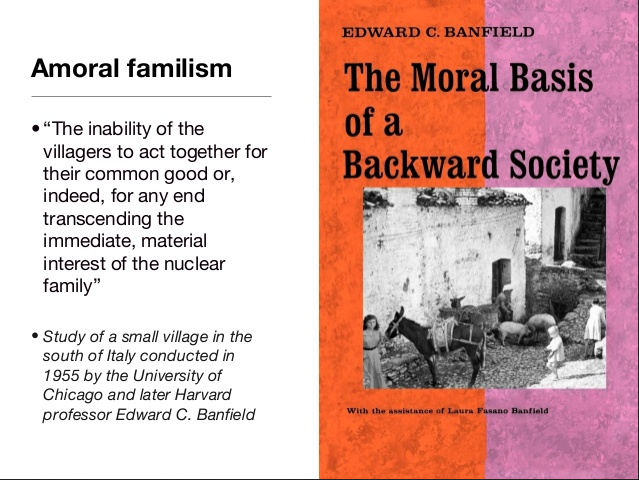 Banfield, un politologo statunitense, nel suo libro “Basi morali di una società arretrata” (1958), indagava sulle differenze tra Nord e Sud, sull’arretratezza di quest’ultimo e andava alla ricerca di un fattore che potesse spiegarla. La spiegazione data fa riferimento all’esistenza, o all’assenza, della fiducia.