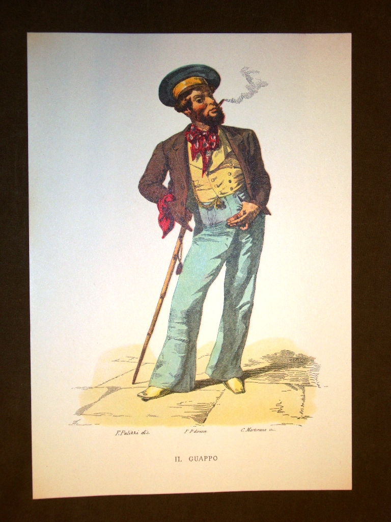 La difficile distinzione, nella Napoli dell’Ottocento, tra guappi e capi della camorra. I criteri adottati da Antonio Mordini. Il significato dell’abbigliamento e della posa del guappo disegnato da Filippo Palizzi per una delle edizioni dell’opera di De Bourcard.