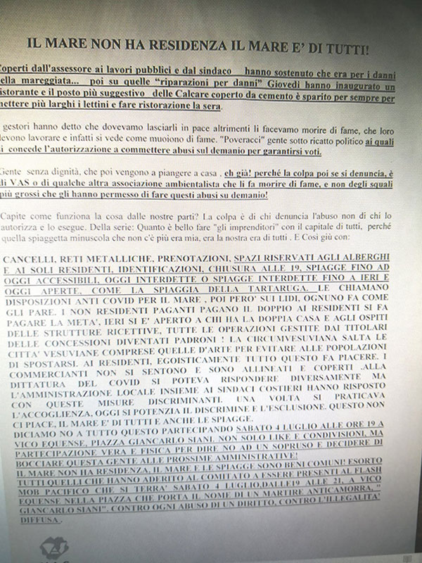 Prendendo spunto da varie ordinanze, recentemente pubblicate dall’amministrazione di Vico e non solo, Franco Cuomo, filosofo contemporaneo, artista e delegato locale dei VAS (Verdi Ambiente e Società) ha redatto un documento (si veda foto a seguire) dal significativo titolo “Il mare non ha residenza”. In esse, con l’appoggio di numerosi sostenitori, Franco Cuomo stigmatizza il senso delle recenti ordinanze che, facendo leva su problematiche legata alla epidemia COVID-19, rendono quasi impossibile l’accesso alle spiagge pubbliche da parte dei non residenti.