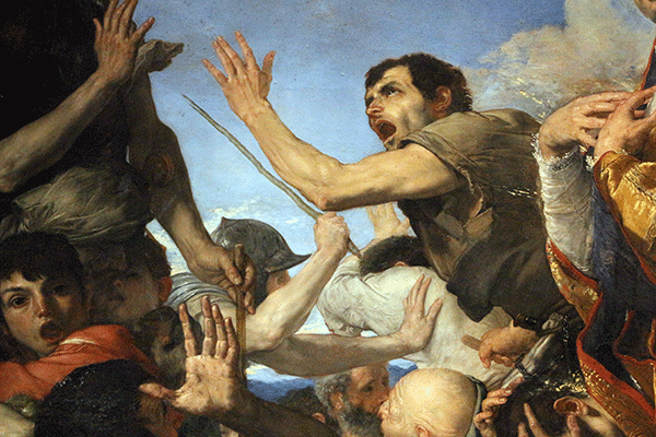 Il capolavoro è costruito come un groviglio di corpi in movimento che cercano di fuggir via dal giovane “terribile” che ha vinto i leoni e il fuoco: è un miracolo che atterrisce, non c’è la meraviglia luminosa che di solito si irradia dai volti di chi è testimone di un miracolo: qui lo stupore diventa immediatamente paura: paura di essere inghiottiti dalle fiamme che invece hanno risparmiato Gennaro, paura che il vescovo dei prodigi possa esercitare il suo sovrumano potere per punire chi non lo ha difeso e chi, dopo averlo tormentato, ora volge verso di lui “i suoi occhi biechi” (De Dominici). Ribera ispira il suo disegno al naturalismo di Caravaggio, le facce dei personaggi sono quelle dei “lazzari” che si incontrano per le strade di Napoli – “lazzaro” è il ragazzo in camiciola rossa che grida verso l’osservatore -, ma nelle bocche urlanti c’è una punta di quella esasperazione sarcastica che è propria dell’arte dello “Spagnoletto”.. Lo vide chiaramente Bernardo De Dominici, e perciò attirò la nostra attenzione sul “grido spaventoso che par che si senta da colui che vedesi dietro al Santo e prossimo alla fornace: un volto orribile, bocca tutta aperta, braccio in alto e tutto disposto alla fuga”. In verità, quando osservi da vicino questo capolavoro, ti pare che il tumulto da percezione visiva diventi, in un attimo, suggestione acustica. Quel volto sfigurato dall’urlo “dietro al Santo” serve anche a far da contrasto con l’espressione di Gennaro, che , nel silenzio dello sguardo stanco, ringrazia Dio per la salvezza e pare che non si accorga del tumulto che ha provocato.