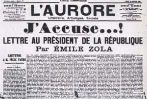 Nel 1894 l’ufficiale di artiglieria dell’esercito francese, Alfred Dreyfus, ebreo, accusato di essere una spia dei tedeschi, venne degradato, processato e condannato al carcere. Alcuni intellettuali sottolinearono subito le stranezze dell’episodio, ma fu Zola con il celebre articolo: “J’accuse –Lettera al Presidente della Repubblica”-, pubblicato sul giornale “L’ Aurore” il 13 gennaio 1898 (vedi immagine in appendice), a parlare di complotto, di documenti d’accusa falsificati, e a fare i nomi degli alti ufficiali dell’esercito che avevano ordito la “congiura” contro Dreyfus: una “congiura” in cui confluivano l’antisemitismo della Destra reazionaria e il “complesso di Sedan” che affliggeva le gerarchie militari francesi dal quel 2 settembre 1870, il giorno in cui l’esercito francese fu costretto ad arrendersi, a Sedan, alle truppe di Von Moltke e la guerra franco- prussiana si concluse con la vittoria della Prussia, con la fine del Secondo Impero di Napoleone III e con la riunificazione della Germania. Zola venne processato per oltraggio alle Forze Armate e condannato a un anno di carcere e a una multa di 3000 franchi, che, con le spese per il processo, venne pagata da Octave Mirbeau. Zola si sottrasse al carcere “esiliandosi” in Inghilterra, ma la precisione delle accuse contenute nella sua lettera al Presidente fece sì che il processo venisse riaperto. Nel 1906 Dreyfus venne definitivamente riabilitato, ma lo scrittore era morto da quattro anni, il 29 settembre 1902, ucciso, sentenziarono gli investigatori, da avvelenamento accidentale di monossido di carbonio: insomma dalle esalazioni di una stufa, che avevano ridotto in fin di vita anche la moglie Alexandrine, salvata dai soccorritori. Nel 1953 l’anziano farmacista Pierre Hacquin raccontò al giornalista Jan Bedel che era stato il fumista Henri Buronfosse a ostruire deliberatamente il camino di casa Zola: lui, il farmacista, l’aveva saputo direttamente dal fumista. Dunque, si trattava di un assassinio “politico”: il fumista e lo stesso farmacista appartenevano a un gruppo di nazionalisti reazionari e antisemiti, la “Lega dei Patrioti”. Però Buronfosse era morto nel 1928, e non si trovarono prove sufficienti per far riaprire il caso. Ma i dubbi restarono, e restano. Perché Zola costruì la sua vita e la sua arte su un principio: “Non posso tacere, non posso essere complice”. Non tacque, da giovane, quando con i suoi articoli sul “Globe” e sul “Sèmaphore” attaccò aspramente la borghesia francese accusandola di aver sacrificato ogni principio morale all’accumulo del danaro – quale che fosse “l’odore” di questo danaro. Non tacque come critico d’arte: non si limitò a schierarsi dalla parte degli Impressionisti e di Manet, ma irrise i pittori dell’Accademia, dell’“art pompier”, Duval, Baudry, Boulanger, Bouguereau, sottolineando la “retorica” dei loro quadri, in cui sarebbe stato inutile cercare un riferimento qualsiasi al “nostro tempo”: inoltre, gli articoli di Zola suscitarono l’aspra reazione di quei critici e di quei mercanti che nell’” art pompier” avevano scoperto, sotto ogni punto di vista “un grande affare”. Zola non tacque come scrittore: nei romanzi del ciclo “Rougon- Macquart” descrisse la società francese con lo spietato rigore di un naturalismo che non solo svelava la corruzione e l’immoralità del liberismo feroce e della borghesia reazionaria, ma anche l’ipocrisia di quegli “umili” e di quei proletari che non lottavano per costruire un mondo nuovo, ma solo per diventare anche essi borghesi (il tema è sviluppato soprattutto nel romanzo “L’Assommoir”). Zola non fu tenero con i poeti “simbolisti” e non nascose la sua amarezza a Huysmans che era stato suo amico, e che con il romanzo “’A rebours”, pubblicato nel 1884, rinnegava il Naturalismo e apriva la stagione dell’Estetismo. Anche tra gli scrittori “naturalisti” non ebbe molti amici: non lo consentirono ora l’invidia di alcuni di essi, ora il carattere aspro dello scrittore, ora il radicalismo con cui egli difendeva i principi del determinismo. Ma nonostante qualche incomprensione Anatole France gli restò sempre amico, e al suo funerale tenne un’orazione commovente sottolineando la grandezza dello scrittore e la coerenza del suo impegno politico. Partecipò ai funerali un folto gruppo di minatori che cantarono “Germinal, Germinal” ricordando il romanzo in cui Zola aveva descritto le loro misere condizioni di vita. Negli ultimi anni la solitudine dello scrittore divenne ancora più intensa, perché si erano complicati i rapporti con la moglie, pesanti erano diventati i problemi finanziari e aveva preso il definitivo sopravvento quel temperamento ombroso che Manet raffigurò in modo splendido nel ritratto dell’amico.