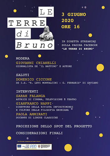 Il 3 giugno, in “diretta streaming”, il convegno conclusivo del progetto. Il D.S. Domenico Ciccone e Gianfranco Nappi ricordano Aldo Masullo, che dedicò a Bruno articoli e libri. La complessità del pensiero di Giordano Bruno, che la Yates, Reale e Antiseri considerano un “mago ermetico, del tipo più radicale”. L’importanza di progetti che consentono ad alunni e a docenti di confrontarsi con i fondamenti della storia culturale del territorio.