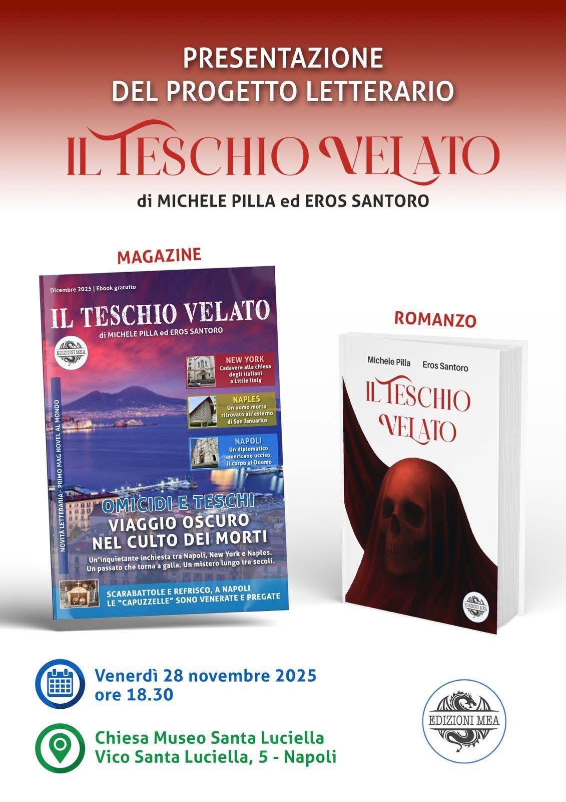 Venerdì 28 Novembre, alle ore 18,30, presso la Chiesa Museo di Santa Luciella ai librai (Napoli) si terrà la presentazione del progetto letterario IL TESCHIO VELATO. Si tratta del primo MAG Novel al mondo, una novità letteraria internazionale.