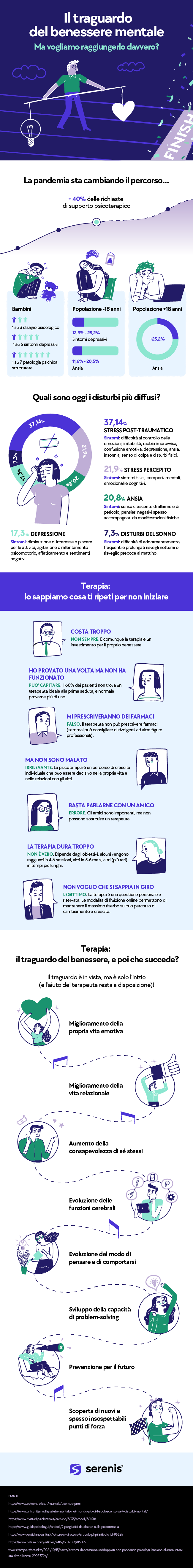 L’infografica di serenis.it – piattaforma di supporto psicologico che offre servizi di psicoterapia in videochiamata – parte da qui per indagare proprio i principali stereotipi e gli ostacoli che ritardano o impediscono l’inizio di un percorso di supporto psicologico. Non solo, descrive i disturbi più comuni e sottolinea i benefici di un percorso per trovare una versione migliore e più consapevole di sé stessi.
