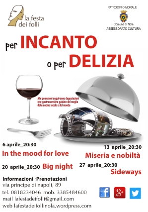 Con il patrocinio morale dell’Assessorato alla Cultura del Comune di Nola, retto dalla assessora arch. Cinzia Trinchese, la rassegna cinematografica per INCANTO o per DELIZIA del ristobistrò culturale la festa dei folli si svolgerà nel mese di aprile, tutti i giovedì alle 20:30.