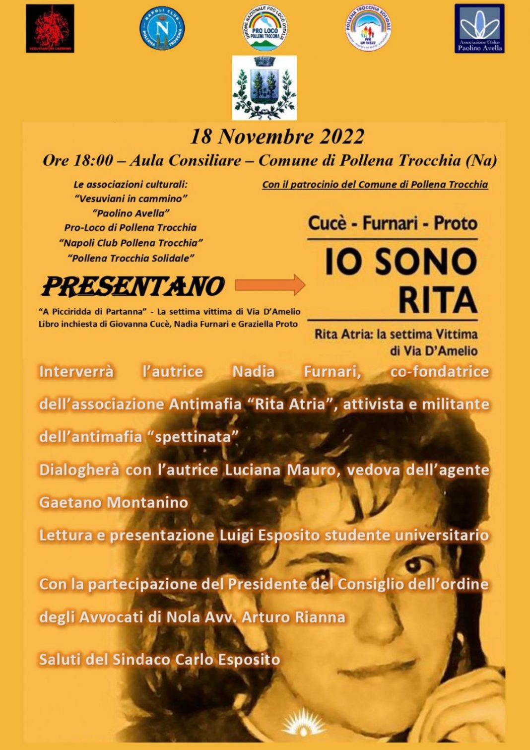 Pollena Trocchia. Il 18 novembre, alle ore 18.00, si terrà presso l’Aula Consiliare del Comune l’evento di presentazione del libro inchiesta “Io sono Rita”, scritto da Giovanna Cucè, Graziella Proto e Nadia Fornari. L’evento è organizzato dalle associazioni culturali “Vesuviani in cammino”, “Paolino Avella”, “Pro-Loco di Pollena Trocchia”, “Napoli Club Pollena Trocchia”, “Pollena Trocchia Solidale”, con il patrocinio del Comune di Pollena Trocchia.