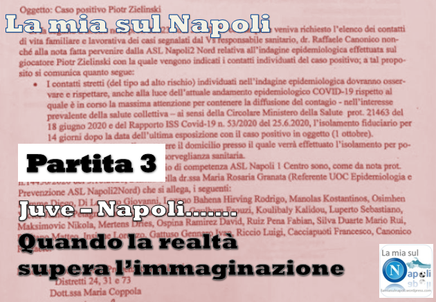 La premessa. La storia che vi sto raccontando vede il suo prologo in Napoli – Genoa, che iniziava con qualche rischio di contagio perché già alcuni genoani sono risultati positivi al Sars-Cov-2. I risultati di altri tamponi porteranno poi il numero di positività a ben 22, nel Genoa si accende un focolaio di contagi, naturale aspettarsi qualche ripercussione sugli azzurri. E infatti dopo pochi giorni risultano positivi Zielinski e Elmas, più un membro dello staff. Non è detto che questo numero non possa aumentare nei prossimi giorni. Il giorno della partenza per Torino arrivano delle disposizioni locali, da parte di ASL e regione, il Napoli non può partire, resta a casa. Viene imposto a Zielinski e tutti coloro che erano stati a contatto con lui (quindi tutti gli altri azzurri) l’isolamento fiduciario obbligatorio. Con una PEC de Laurentiis comunica l’accaduto a Lega, FIGC, giudice sportivo e Juventus, chiedendo il rinvio della gara.