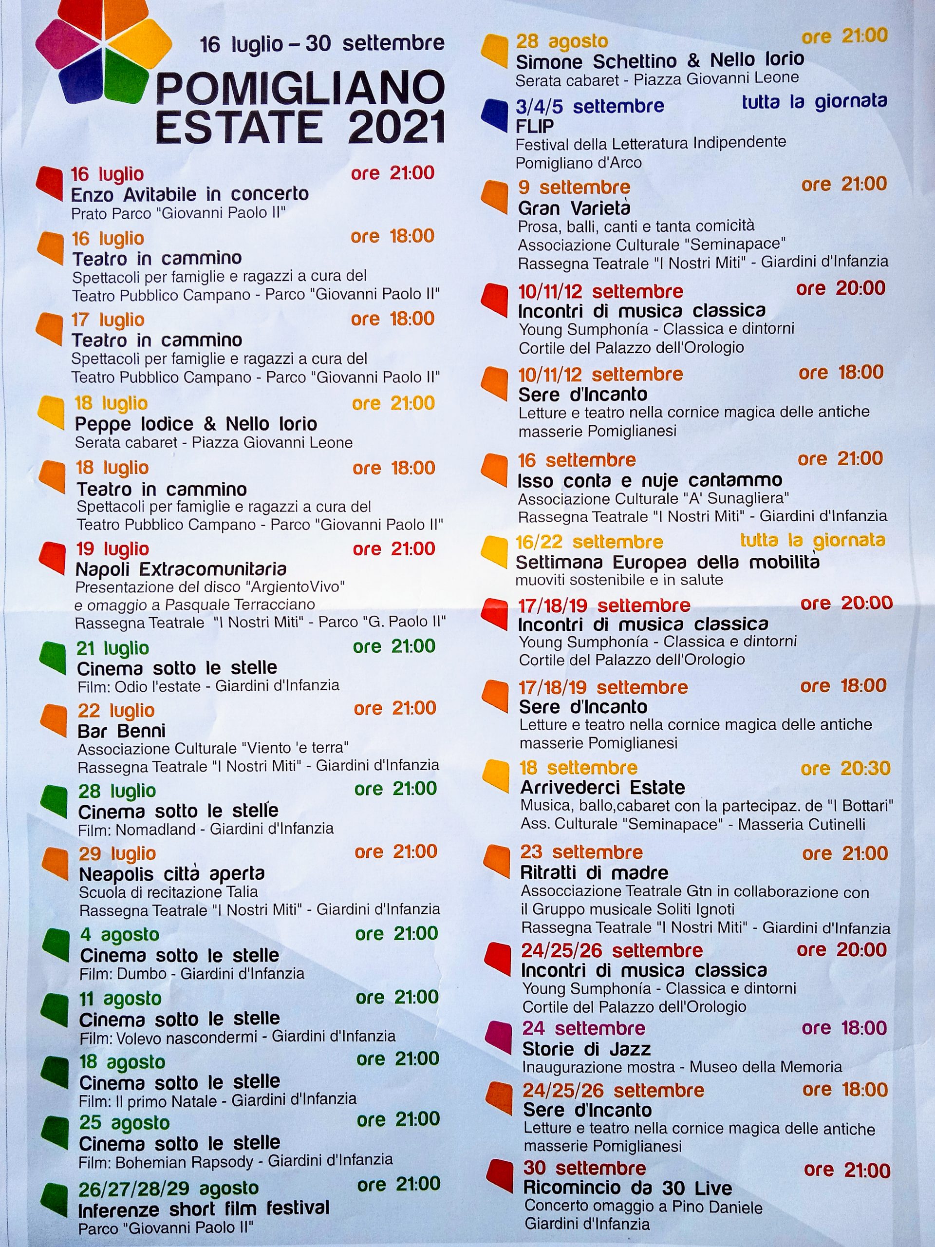 “Nel programma dell’Estate a Pomigliano – spiega il sindaco Del Mastro – abbiamo tentato di sintetizzare l’identità culturale del territorio. Mi appello però all’autodisciplina di tutti: mascherina obbligatoria distanziamento”. Il primo cittadino di Pomigliano è consapevole della situazione che sta attraversando la Campania e del rischio in corso di rimpiombare in zona gialla a causa dell’aumento dei casi di Coronavirus. “Ovviamente nel corso di Pomigliano Estate – ha spiegato Del Mastro ieri – rafforzeremo i controlli e adegueremo la gestione degli eventi in base a tutti i provvedimenti sanitari eventualmente adottati da Governo e Regione. Ma non potevamo non fare niente. La città merita un evento del genere e i lavoratori dello spettacolo e della cultura, che sono fermi da un anno e mezzo, meritano a loro volta una politica in grado di dare segnali positivi sul fronte della ripresa e del rilancio culturale, economico e produttivo”.