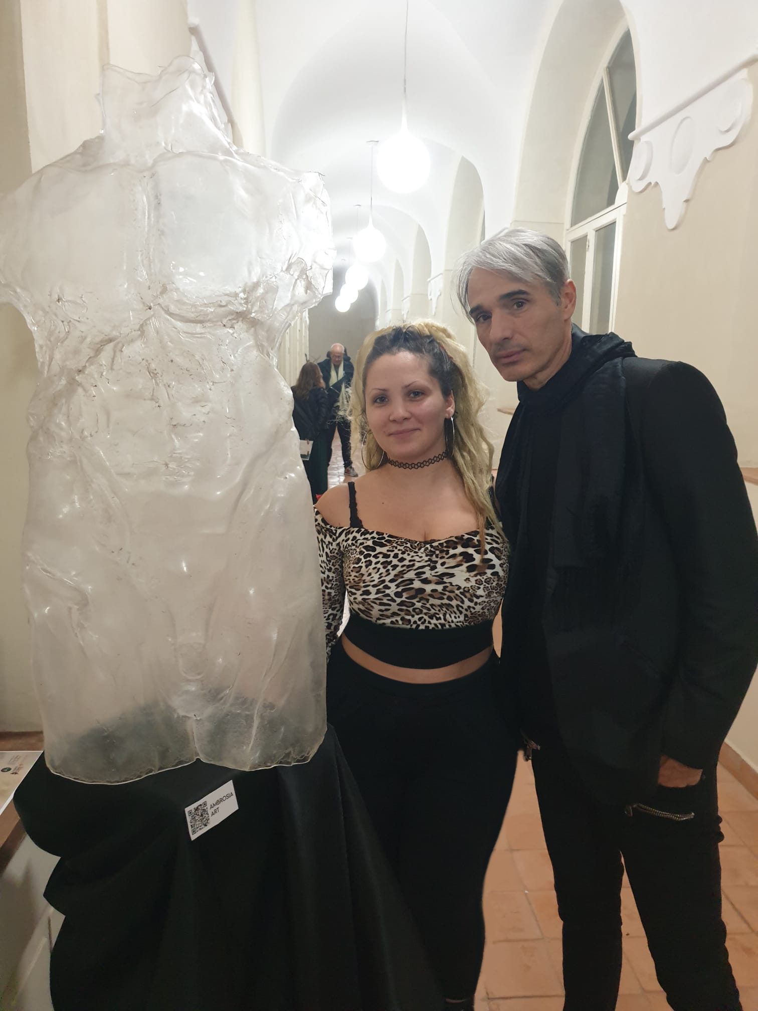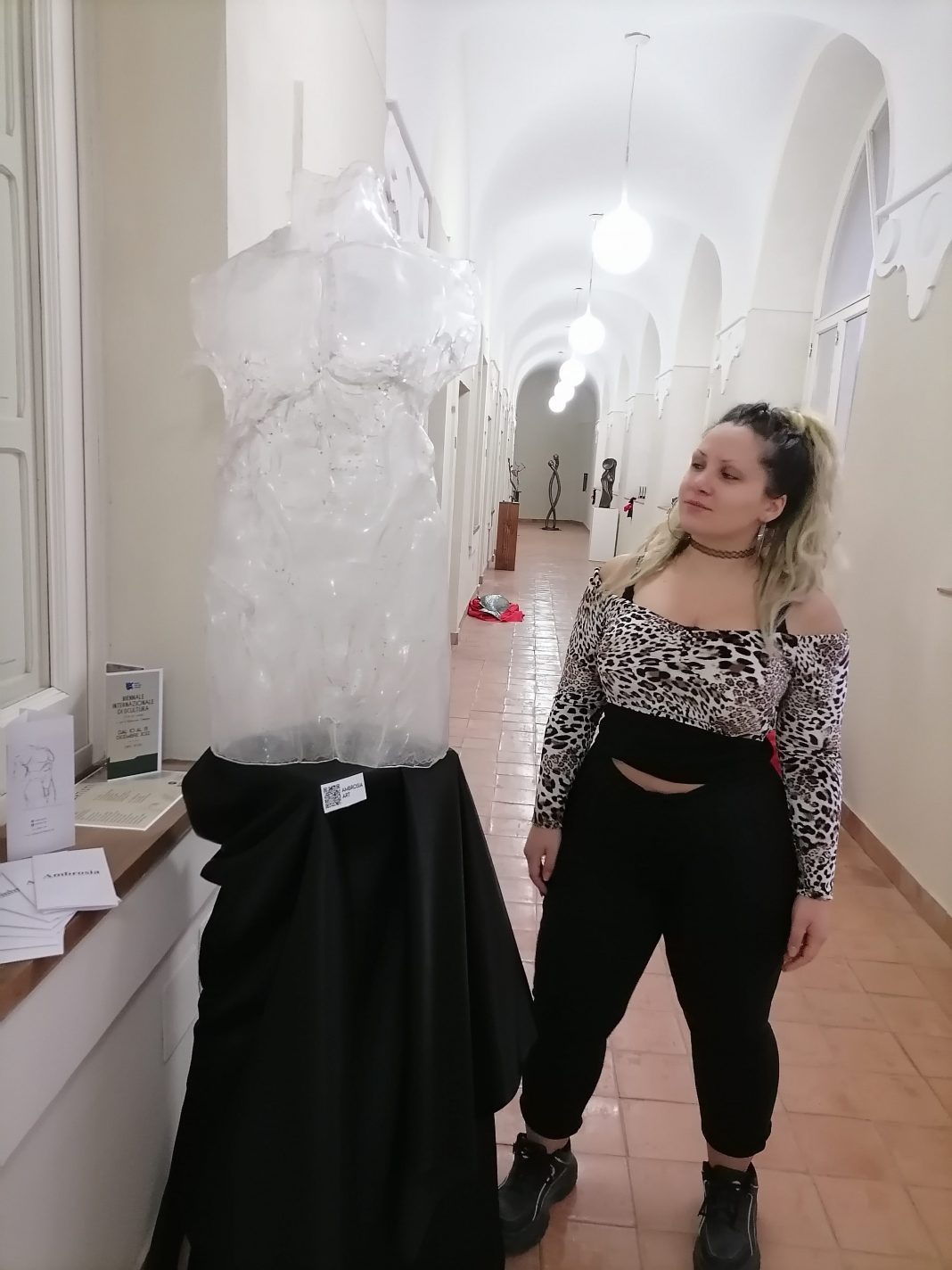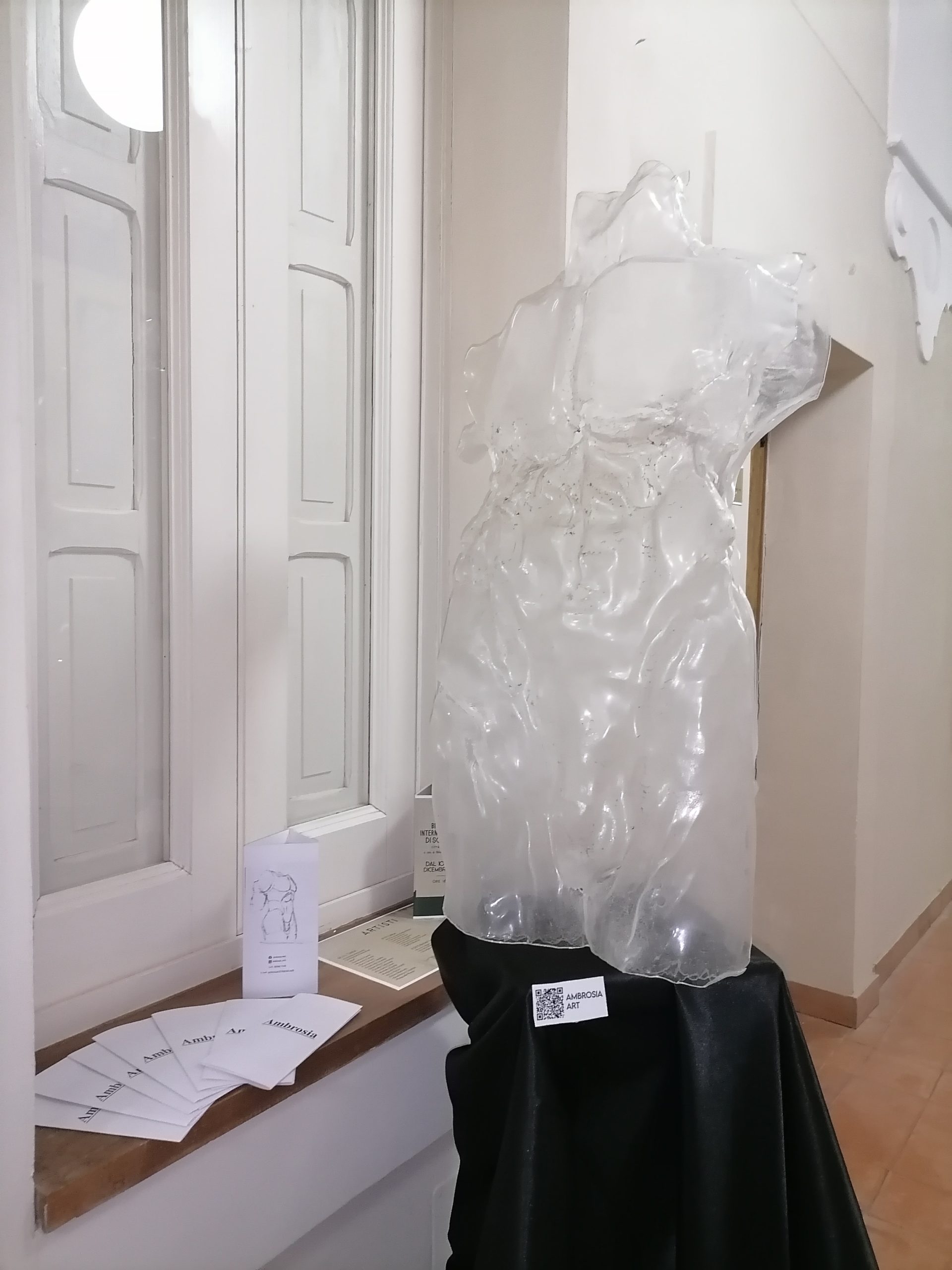 Per questa occasione Ambrosia ha progettato e realizzato la scultura da esporre per la Biennale, alta un metro circa ed eseguita con una tecnica particolare appositamente per il materiale scelto, ovvero il plexiglass, un materiale plastico di difficile lavorazione specialmente se il soggetto è un corpo maschile con addominali e parti anatomiche particolarmente definite. Annalisa Ambrosia è una dei rari artisti ad utilizzare tale materiale per la realizzazione delle sue sculture, forse l’unica. Ha iniziato con la pittura e adesso da circa un anno l’artista Ambrosia si dedica alla pratica scultorea, attualmente studia all’Accademia di Belle Arti a Napoli. Ricerca e studio sono focalizzati sul corpo maschile nella ripresa del bello assoluto, dei canoni, dell’arte classica, dei concetti di forza e pose plastiche. Il corpo – nei lavori dell’artista – segue il modello estetico che diviene contemporaneo nell’eccessiva muscolatura, e in questo caso nelle opere della serie In-Corporeo si va oltre il corpo, il titolo racchiude un doppio significato che è pertinente all’opera scultorea stessa. Si considera il significato stesso della parola “incorporeo” immateriale, evanescente; e, allo stesso tempo “in corporeo”, ovvero dentro il corpo. Da questo binomio la scelta del materiale trasparente che ci conduce alla vera essenza del corpo.