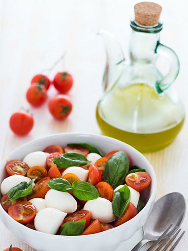 Ingredienti: 500 g mozzarelline ciliegine; 500 g pomodorini ciliegini; 10 foglie di basilico; q.b. olio extravergine d’oliva; q.b. sale fino Come prima cosa, per preparare l’insalata caprese, sgocciolate le mozzarelline dalla loro acqua di conservazione mettendole nel colapasta .Prendete i pomodori -ciliegini, eliminate il picciolo, lavateli sotto l’acqua fredda, asciugateli e tagliateli a metà. Metteteli in una terrina, salateli secondo i vostri gusti e mescolateli per farli insaporire.. Aggiungete le mozzarelline sgocciolate ai pomodorini, versate l’olio extravergine a filo e decorate con le foglie di basilico (precedentemente lavate ed asciugate). Ecco, la vostra insalata caprese è pronta. (la ricetta è pubblicata sul blog “giallozafferano”)