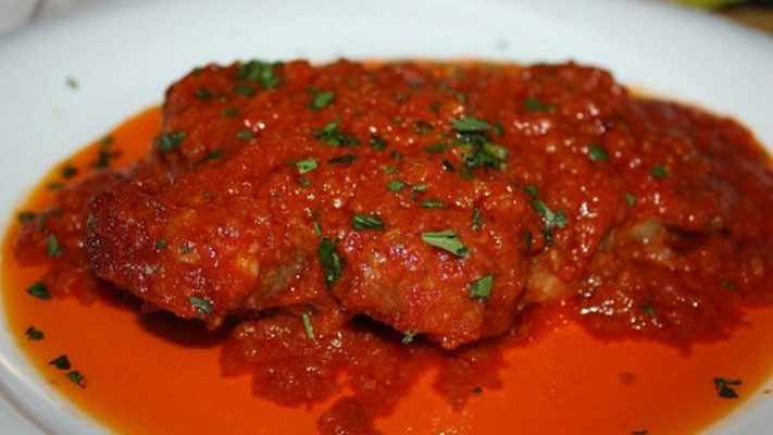 Ingredienti: gr. 500 di fettine di carne; 400 g di pomodorini maturi; un rametto di origano, sale, pepe, due spicchi d’aglio, 4 cucchiai di olio extravergine d’oliva. Lavati con cura sotto l’acqua corrente i pomodorini, asciugateli con un panno da cucina e tagliateli a metà. In una padella larga versate 4 cucchiai di olio extravergine di oliva e lasciate riscaldare a fiamma abbastanza vivace. Aggiungete prima gli spicchi di aglio dopo averli sbucciati, facendoli rosolare da ambedue le parti, e poi i pomodorini, abbassando leggermente la fiamma, e infine le foglie di origano . Coprite la pentola con un coperchio e lasciate cuocere il sugo per circa 10 minuti. A questo punto disponete nel sugo le fettine di carne, con un pizzico di sale e con una “punta” di pepe nero fresco. Coprite di nuovo la pentola e lasciate cuocere per altri 10 minuti girando la carne a metà della cottura perché questa risulti uniforme. Spenta la fiamma, lasciate intiepidire la “pizzaiola” qualche minuto prima di servirla a tavola.(La ricetta è quella pubblicata dal sito “ Amalfinotizie”, che consiglia di usare il manzo o il vitellone nei tagli della fesa, dello scannello, dello scamone, o la carne di girello).