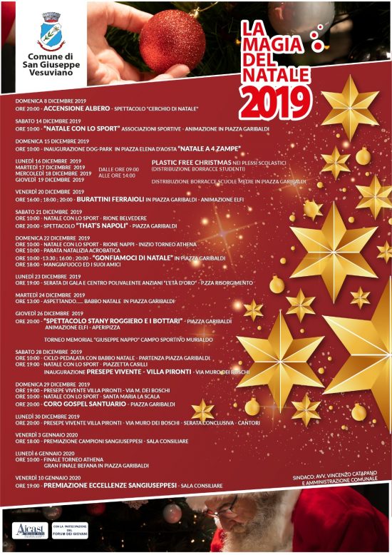 Il Natale a San Giuseppe Vesuviano inizia, quest’anno, domenica 8 dicembre, con l’accensione dell’albero di Natale in piazza Garibaldi, alle ore 20:00, preceduta dallo spettacolo “Cerchio di Natale”.