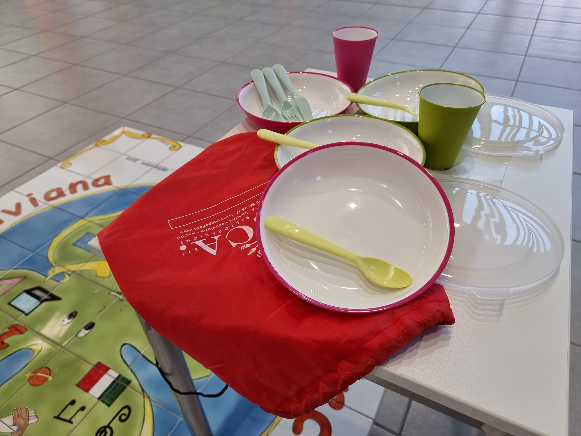 Questo è l’obiettivo dell’azienda Ri.Ca, che si impegna a rendere la mensa scolastica sostenibile ed ecologica, consegnando agli alunni, per il secondo anno consecutivo, questo coloratissimo kit di stoviglie riutilizzabili. Infatti, il coordinato è costituito da piatti, scodelle e bicchieri fatti di un materiale che sfrutta la tecnologia antibatterica Microban, mentre le posate sono in plastica resistente e lavabile.