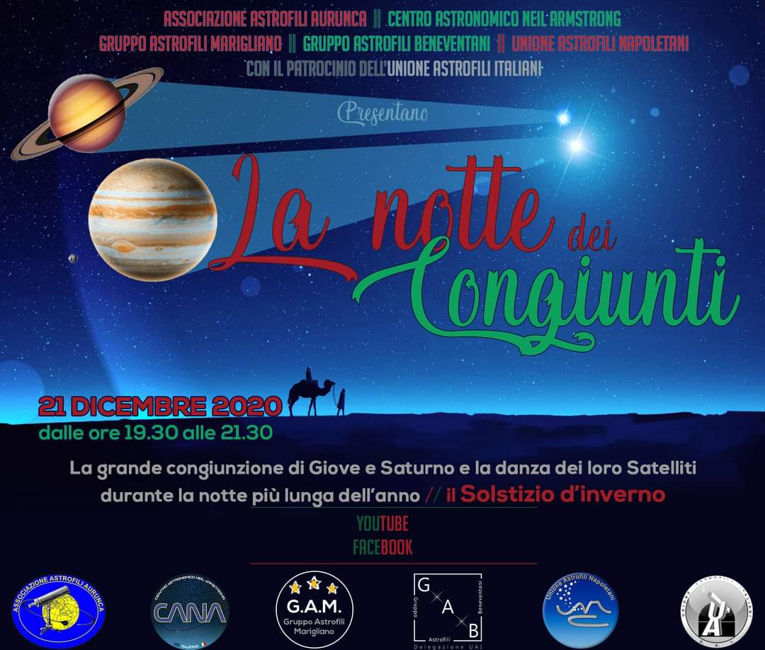 Il giorno 21 dicembre 2020 saremo testimoni di un evento singolare: la grande congiunzione di Giove e Saturno. I due pianeti appariranno vicinissimi ad occhio nudo, un evento di grande rarità e fascino considerando che avverrà proprio nel giorno del solstizio d’inverno, durante la notte più lunga dell’anno. In occasione di tale evento molte associazioni locali di amanti delle stelle hanno deciso di congiungersi, proprio come fanno i pianeti, per regalare al pubblico una conferenza online semplice e divertente sui fenomeni astronomici del 21 dicembre e, condizioni meteo permettendo, mandando in streaming l’immagine degli oggetti più interessanti del cielo invernale, tra cui anche la Luna che farà da accompagnatrice ai pianeti durante il solstizio.
