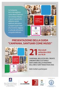 Sei i musei, con i relativi santuari che li ospitano, inseriti all’interno del volume: il Museo Etnostorico delle genti Campane a Somma Vesuviana, il Museo del Complesso Monumentale di San Vito A Marigliano, il Museo Diocesano di Pompei, il Museo degli Ex-voto a Madonna dell’Arco, il Museo Gerardino di San Gerardo Maiella a Caposele e il Museo d’Arte sacra Confalone a Maiori. Di essi la pubblicazione “Campania, santuari come musei” non intende solo presentare la storia e le caratteristiche dei luoghi sacri e dei patrimoni museali in essi custoditi, ma aspira anche a suscitare un più profondo interesse verso il territorio su cui le realtà museali selezionate insistono. “Campania, santuari come musei” vuole proporsi, dunque, come uno strumento che invita ad osservare l’offerta turistica locale secondo una prospettiva nuova, ampliando, attraverso alcuni peculiari luoghi e musei, il focus sull’intero panorama di ricchezze della nostra regione. La pubblicazione sarà disponibile anche nel formato audioguida scaricabile gratuitamente dal sito web www.terredicampania.it. All’evento di presentazione interverrà la Dirigente dell’UOD 50.12.01, Anita Florio. L’iniziativa è realizzata con il contributo della Giunta Regionale della Campania – Direzione Generale 50.12 “Politiche culturali e il Turismo ”Unità operativa dirigenziale 01 “Promozione e valorizzazione dei Musei e delle Biblioteche” Decreto Dirigenziale n.91 del 20/05/2022.