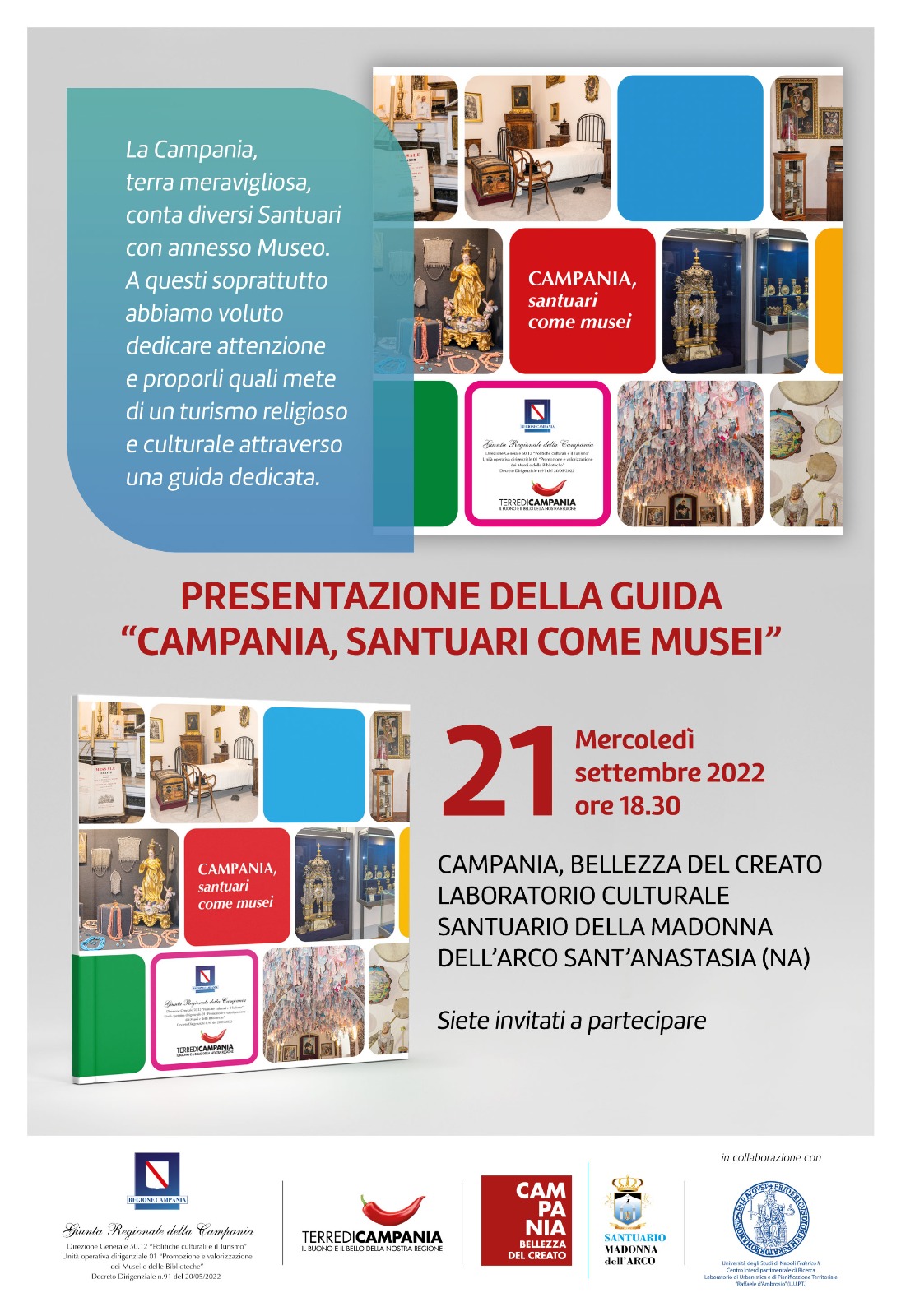 La nuova guida sul patrimonio museale regionale “Campania, santuari come musei”, realizzata dall’Associazione Terre di Campania Pas, sarà presentata, mercoledì 21 settembre, alle ore 18,30, presso il Laboratorio culturale “Campania, bellezza del Creato” ospitato nel Santuario della Madonna dell’Arco di Sant’Anastasia (NA). Terre di Campania, impegnata sin dalla sua fondazione nella realizzazione di concreti progetti di valorizzazione e promozione territoriale, ha inteso dedicare questa nuova pubblicazione ad una selezione dei musei della regione Campania caratterizzati dalla particolarità di essere ospitati all’interno di Santuari. Questi luoghi sacri accolgano, tra le proprie mura, esempi di virtù umane e storie di Santi e beati, di uomini e donne che hanno lasciato una traccia profonda nella storia del nostro territorio e delle genti che lo abitano. I santuari esplorati all’interno della pubblicazione sono però, al contempo, anche dimore di cultura ed arte, ospitando musei entro cui sono esposte collezioni ricche di sculture, dipinti, elementi architettonici decorativi, ma anche oggetti e simulacri appartenenti ai santi che vi hanno dimorato, oltreché alle genti comuni dei rispettivi territori.