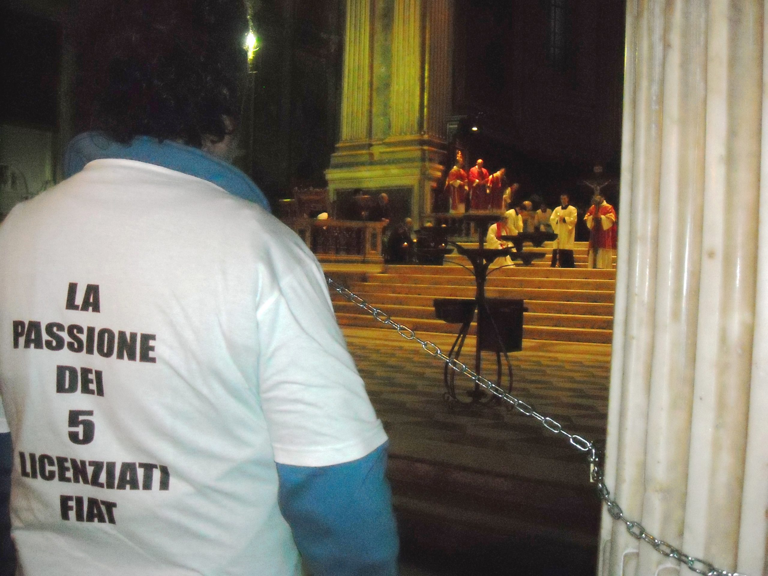Tre sabati di straordinario alla Fiat di Pomigliano, il 2, il 9 e il 16 aprile prossimi. Le produzioni della Panda vanno sempre molto bene e il lavoro, dunque, non manca. Straordinari, questi di aprile, che si aggiungeranno agli otto già effettuati dall’inizio dell’anno. Ma resta tanta sofferenza. Parallelamente a questo vero e proprio boom produttivo, prosegue infatti la protesta dei 5 licenziati dello stabilimento logistico Fiat di Nola, estromessi due anni fa dopo aver manifestato davanti all’impianto contro i suicidi di due operai. Ieri sera sono stati protagonisti di un’azione clamorosa: due di loro, Mimmo Mignano, 49 anni, di Sant’Anastasia, e Massimo Napolitano, 51 anni, di Acerra, si sono incatenati a una colonna del duomo di Napoli, davanti all’altare, mentre l’arcivescovo, il cardinale Crescenzio Sepe, stava officiando la messa che precede la Via Crucis. Alla fine, dopo una mediazione con la polizia, i manifestanti si sono tolti le catene e hanno incontrato l’arcivescovo in una cappella. Qui gli hanno consegnato una lettera aperta indirizzata a papa Francesco. “So che il vescovo di Nola si è occupato del vostro caso”, ha detto Sepe ai manifestanti. Mignano ha consegnato all’arcivescovo la lettera, nella speranza che questa venga “girata” a papa Francesco. “Siamo cinque operai Fiat che sono stati licenziati -è scritto nella missiva – perché abbiamo contestato pacificamente e con ironia il nostro padrone, stanchi di tanti anni di cassa integrazione e dei suicidi dei nostri colleghi”. Subito dopo aver consegnato la lettera Mignano ha abbracciato il cardinale. Alla fine Sepe ha guadagnato la strada dell’uscita verso la Via Crucis. Ma non ha voluto rilasciare nessuna dichiarazione sull’accaduto.