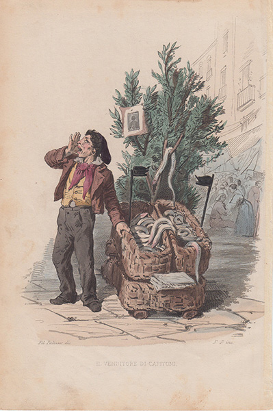 Il grande scrittore non aveva dubbi: il giorno della Vigilia di Natale a Napoli è a tal punto “di affaccendamento, di capogiro, di cuccagna, che mai le parole non potranno presentarne l’immagine a chiunque non sia stato in questa città il 24 dicembre di qualunque anno”. In verità, fin dai primi giorni di dicembre iniziava per tutti il tempo dell’attesa: gli impiegati e i commessi aspettavano le “gratificazioni”, i medici e gli avvocati speravano che i loro clienti portassero capponi e caciocavalli, gli “uscieri, i domestici, i portinai, i ciabattini e i facchini” pregustavano mance e regalie e si preparavano a smuovere la generosità degli altri “con l’assalto dei cento e cento di questi giorni”.Per le scale era un viavai di panieri pieni di regali e di vassoi di torte e di dolci. Le “feste di Natale” erano dedicati tutte all’abbondanza del cibo: tutti i frutti della Terra e tutte le carni degli animali che volano in cielo e vivono nel mare e nei fiumi venivano esposti sui banchi a Toledo, a Santa Brigida, a Porta San Gennaro, al Pendino. Era tale l’abbondanza di viveri a Napoli nei giorni natalizi che non solo tutti gli abitanti dell’Europa sarebbero stati agevolmente sfamati, ma tutti i popoli del mondo avrebbero trovato “il loro cibo prediletto e indigeno”: Mastriani sapeva stemperare l’iperbole nell’ ironia. I poveri, “la bassa gente”, si tutelavano con il “canestro di Natale”, una tradizione che resiste ancora: per tutto l’anno pagavano ai salumieri “ 5 o 6 grani per ogni settimana” – il “grano” era la centesima parte del ducato – e a Natale ricevevano una cesta piena di cibo natalizio, una cesta che i Napoletani chiamavano “sfrattatavola”. Splendida è la descrizione che Mastriani fa dei banchi dei venditori: colonne di frutta fresca e secca, trofei di uva e di mele, “stelle di fichi secchi, piramidi di agrumi, baldacchini di noci, una formidabile artiglieria di pigne”; e poi le ceste dei pescivendoli, in cui guizza il capitone, il re dei pesci di Natale, “con sua moglie l’anguilla, e cernie, calamaretti, cefali e merluzzi”. Dettò a Mastriani parole di pietà la triste sorte di migliaia di capponi, “destinati a funzionare sulle mense la mattina del Santo Natale e condannati ad essere portati in giro per la città per parecchi giorni, senza ricevere cibo, “per modo che un digiuno di vari giorni precede per essi la pena capitale”. Il pathos di questa scena che mette sullo stesso piano uomini e animali è una caratteristica della potente “visione” di Mastriani. Davanti ai negozi dei “confettieri” c’erano, già nei giorni che precedevano la Vigilia, ceste ripiene di mostaccioli, ma nessuno osava “derubare” anche un solo dolce, poiché “la religiosa solennità del giorno ispira a tutti sentimenti di onestà e di amore”. I pasticcieri “Barbati e Lambiase sono gli eroi della giornata in fatto di dolci, siccome il Zi’ Francisco a Santa Brigida è il Nestore dei venditori di salami. Castelli di zucchero e fortezze di cioccolata sorgono alle porte di quei due Michelangeli della ghiottoneria napolitana; i bastioni di questi castelli sono tenerissimi e i denti vi si affondano con facilità e piacere.”. “La mattina della Vigilia di Natale Napoli non è che una immensa cucina, siccome la sera non è che un immenso banchetto”. Accresceva lo smisurato trambusto di questo giorno la cerimonia del “donativo natalizio” che per antica tradizione la Città di Napoli inviava all’ “Augusto Monarca nostro Signore” proprio il 24 dicembre e che comprendeva cibi scelti “di ogni stagione e di ogni contrada”. Per tutto il giorno migliaia di Napoletani facevano la fila davanti ai banchi dei “tronari”, dei venditori dei fuochi di artificio, che ogni anno inventavano qualche “botta” nuova, e offrivano ai clienti “fuochi” “di ogni dimensione, di ogni nome, di ogni forza, di ogni rumore e di ogni colore: tuoni, fiaschelle, folgori, folgori pazze, tric- trac, fit-fit”. Il banchetto della sera della Vigilia si apriva, per i ricchi e per i poveri, con i vermicelli e il cavolfiore: seguivano, a “seconda del gusto e dell’agiatezza”, capitone, anguilla, ostriche, mostaccioli, “susamielli e ogni sorta di seccumi”. A mezzanotte incominciava lo spettacolo dei fuochi di artificio, e a tavola si susseguivano i brindisi e gli abbracci, “ogni sofferenza sparisce, tutti sono ricchi, tutti contenti, i vecchi tornano fanciulli e si mischiano all’ilarità dei giovani.” L’uomo malvagio si siede accanto all’uomo giusto, “poiché questa è l’ora in cui tutte le umane colpe sono riscattate”. Poi era Natale: la preghiera prendeva il posto dell’allegria, lo zampognaro intonava l’ultima novena, tutti entravano nel silenzio del raccoglimento, le campane suonavano a festa e la pace si spandeva sulla Terra. “Il dì di Natale tutto sparisce, quasi per incanto; tutte le botteghe sono chiuse; tutto è nettezza e quiete”.