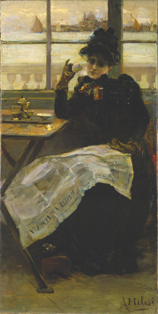 Mi diverto a sfogliare e a leggere le carte: una “memoria” sulla scarsa attenzione che i pittori napoletani dell’Ottocento hanno dedicato ai Caffè e al caffè – e perciò ho scelto a corredo dell’articolo il capolavoro veneziano di Alessandro Milesi – aforismi e battute di intellettuali e di artisti, un lungo elenco di appunti sul ruolo del caffè nella canzone napoletana, nei film, nei “gialli”, le lezioni di Eduardo, di Viviani e di Matilde Serao, e, sottolineata con forza, la “sentenza” di Georges Courteline che “si cambia più facilmente religione che caffè” – e perciò prendere il caffè è un rito, è, lo ha scritto Francesco Battistini, come recitare una preghiera.