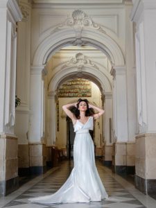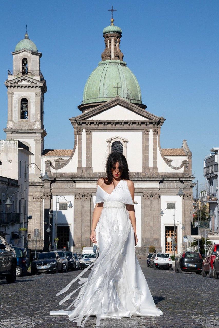 Napoli, bella e tormentata, tramutata in abito da sposa. Una creazione di Luisa Esposito Gifuni che, con la figlia Alba, guida l’Atelier omonimo di Sant’Anastasia. Per il servizio fotografico, Luisa ha scelto, chiedendole di diventare modella per un giorno, la giornalista de “Il Mattino” Mary Liguori. Una iniziativa che ha fini solidali giacché il ricavato della vendita dell’abito da sposa sarà interamente devoluto alla Caritas parrocchiale del santuario Madonna dell’Arco nei pressi del quale, da via D’Auria dove oggi ha sede, si trasferirà tra pochi mesi l’Atelier.
