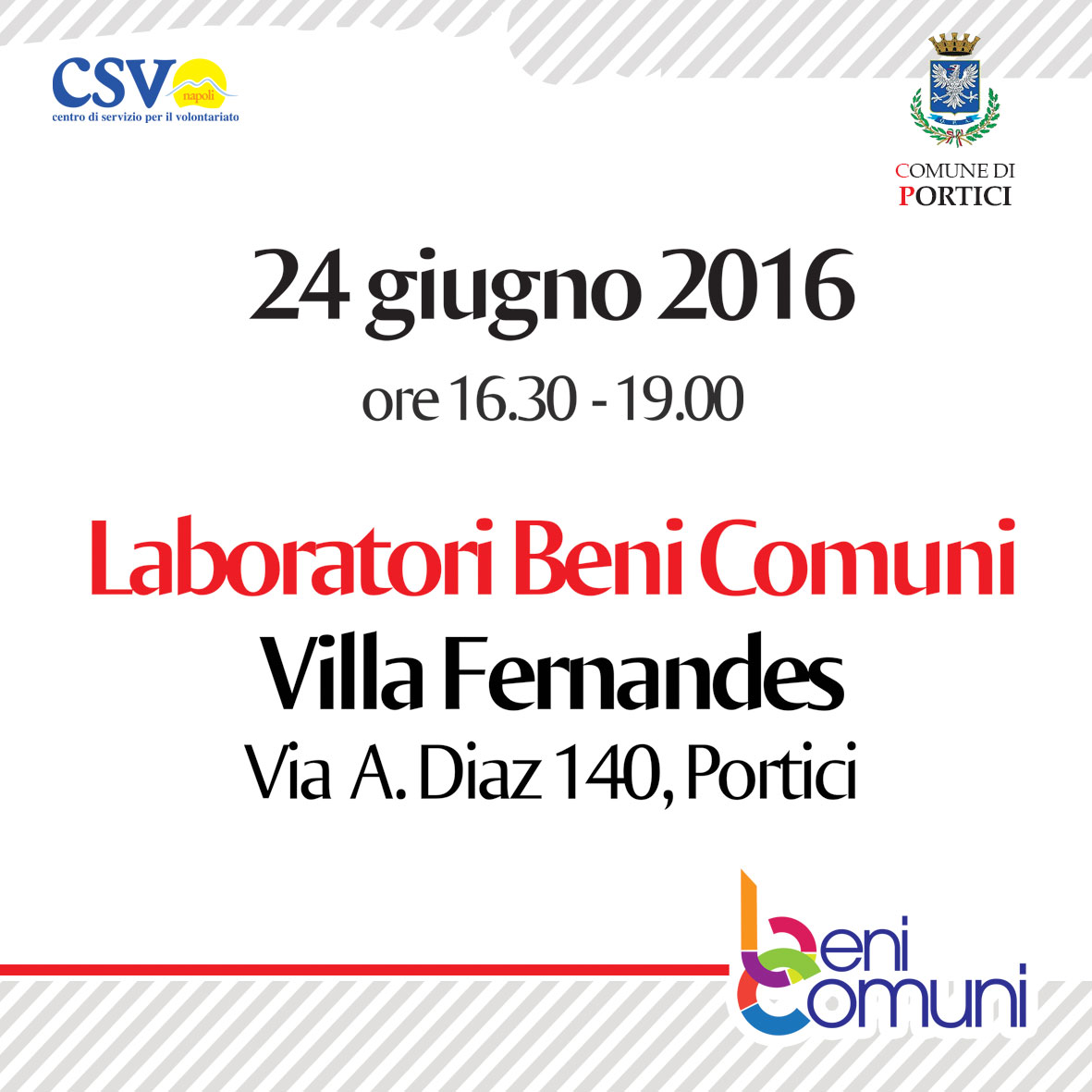 Si terrà a villa Fernandes a Portici (via Diaz, 140), venerdì 24 giugno alle 16.30, il secondo appuntamento dei “Laboratori Beni Comuni” organizzati da Csv Napoli.