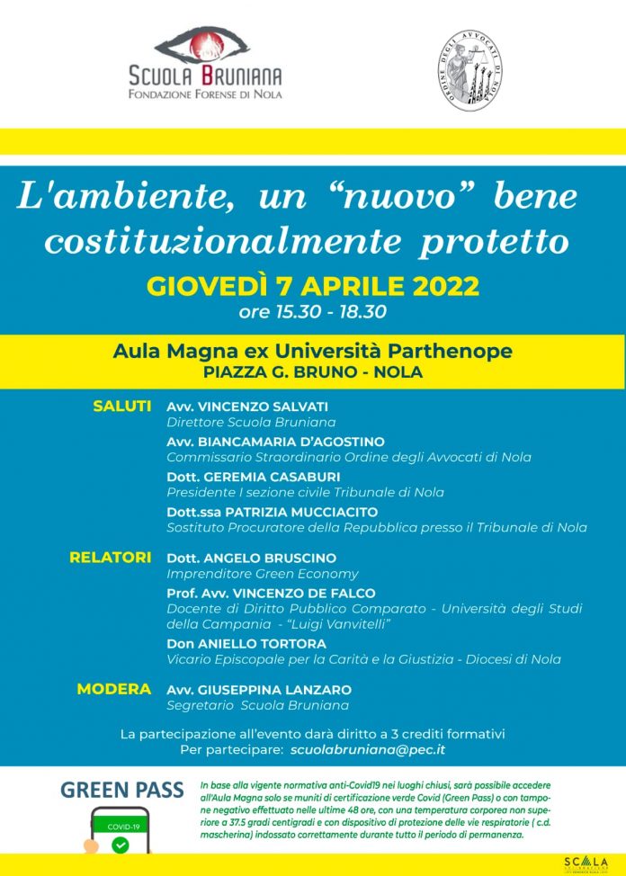 NOLA – «L’ambiente, un “nuovo” bene costituzionalmente protetto». Questo il titolo del convegno che si terrà giovedì 7 aprile, a partire dalle 15,30 presso l’aula magna dell’ex Università Parthenope in piazza Giordano Bruno, a Nola. L’incontro è organizzato dalla Scuola Bruniana – Fondazione forense di Nola e dall’Ordine degli Avvocati di Nola e darà diritto a tre crediti formativi (per iscriversi è necessario mandare una email a scuolabruniana@pec.it).