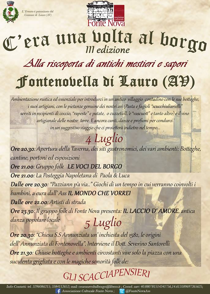 Torna la manifestazione organizzata dall’ Associazione Culturale Fonte Nova, incentrata sul folclore e la tradizione, alla riscoperta di antichi mestieri e sapori. Ambientazione rustica ed essenziale per introdurre l’ ospite in una dimensione antica che attraverso scorci, profumi, sapori e musiche di un tempo lo proietterà indietro nel tempo. Chi visiterà il borgo sabato 4 luglio, troverà artigiani alle prese col proprio lavoro manuale, bambini e i loro giochi di strada, antichi portoni, cantine, la taverna in cui poter assaporare il buon vino delle cantine locali e gustare le pietanze tipiche (Pasta e fagioli scucchiularielli, rapeste e patate, pizza della nonna, vascuott c’a pummarola, ‘o cuzzetiell), e vari ambienti, gastronomici e non, che racconteranno il borgo di un tempo. Non mancherà la musica popolare, la posteggia napoletana e il Laccio d’ amore, antica danza folcloristica locale.