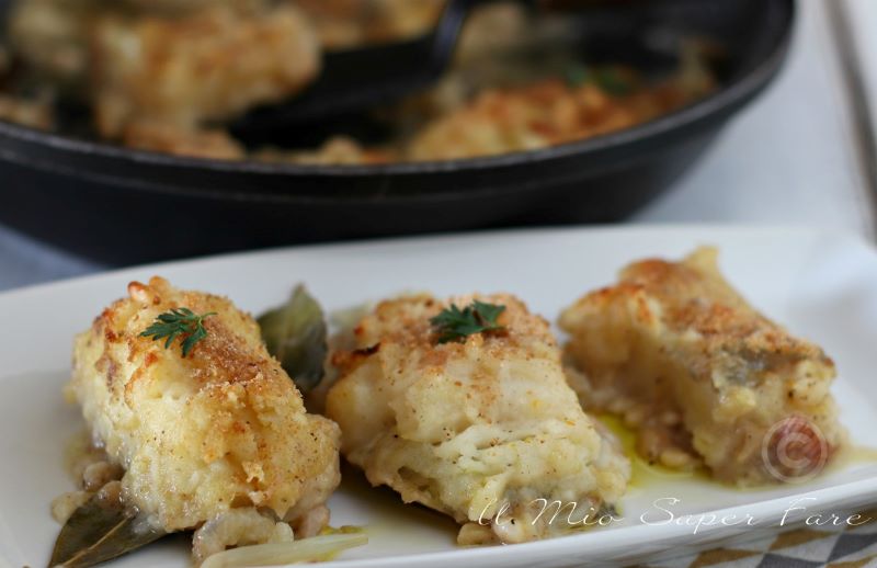 Ingredienti (6 persone): 1,2kg di baccalà già ammollato, farina, 1 dl di olio d’oliva, uvetta, pinoli, candito tritato, pepe di mulinello (a piacere), cannella e noce moscata grattugiate, zucchero a piacere, 2 cipolle tritate, 2 acciughe salate, lavate, sfilettate e tritate, ½ bicchiere di vino bianco. Liberate il baccalà dalle spine, strizzatelo e tagliatelo in riquadri di 3-4 cm. Passate questi riquadri nella farina, poi fateli soffriggere in padella, in ½ bicchiere di olio, con l’uvetta, i pinoli, l’olio, l’origano, il pepe, il sale e gli altri aromi. Riscaldate una teglia, spalmate sul fondo l’olio restante e sistematevi il tutto. Coprite con un foglio di alluminio e mettete nel forno a 150 gradi. Ogni quarto d’ora rivoltate il tutto e negli ultimi minuti togliete il foglio d ‘alluminio e fate leggermente dorare (La ricetta è presa dal libro di A. Parlato “Sua Maestà il baccalà” e l’immagine è tratta dal sito” GialloZafferano”)