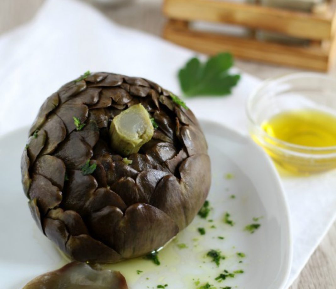 Ingredienti: 4 carciofi “mammole”, 2 spicchi di aglio, 1 ciuffo di prezzemolo, sale, pepe, olio extravergine. Per il pinzimonio: olio, sale e pepe. Preparare un trito di aglio e prezzemolo, togliere ai carciofi il primo giro di foglie, tagliare una parte del gambo e liberarla dai filamenti legnosi. Allargare gradualmente i carciofi fino ad aprili del tutto, lavarli con cura sotto l’acqua corrente, metterli a gocciolare a testa in giù e poi condirne l’interno con un pizzico di sale e di pepe, con un filo d’olio e un cucchiaino del trito di aglio e prezzemolo. Mettere i carciofi in una pentola, incastrarli uno accanto all’altro, versare l’acqua lasciando che copra i carciofi fino alla metà, coprire con il coperchio e cuocere per circa 40 minuti (se la pentola è a pressione, bastano circa 15 minuti). Completata la cottura, togliere i carciofi dall’acqua e servirli con il “pinzimonio” (Ricetta e immagine del “piatto” derivano dal sito “La cucina di Reginé”).