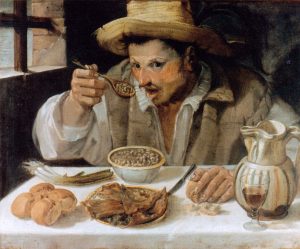 Appena arrivarono dall’ America, i fagioli divennero subito la “carne” dei poveri: nel Vesuviano, ancora a metà del ‘900, le massaie dicevano che nella “pasta e fagioli” i fagioli dovevano risultare, a fine cottura, “carnosi”: “si se fanno troppo muolli, allora è nu pastrocchio”. Era fatale che a questi nuovi protagonisti della tavola degli “umili” e della cultura popolare anche alcuni pittori del Rinascimento prestassero la loro attenzione. I quadri di cui oggi parliamo, il “mangiafagioli” di Vincenzo Campi (1536 – 1591) e il “mangiafagioli” di Annibale Carracci (1560- 1609) sono considerati quadri di “genere”. E’ un giudizio ingeneroso, perché le due opere sono ricche di riferimenti, anche ironici, a una realtà concreta.