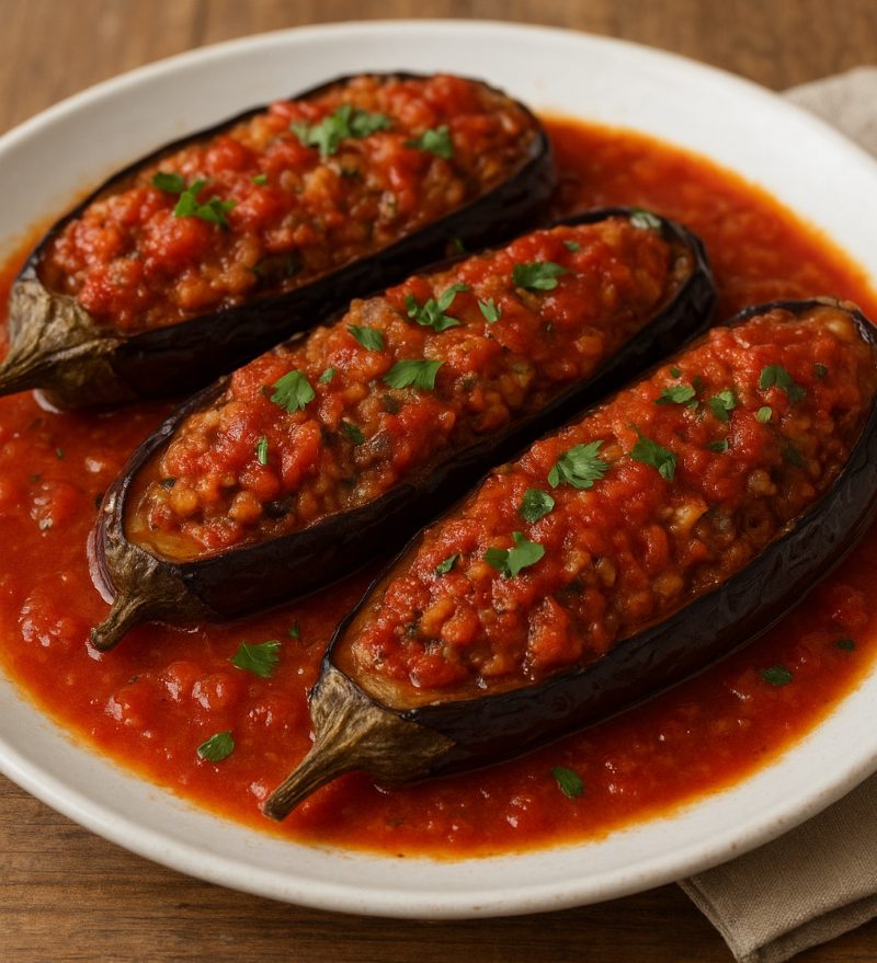 Ingredienti: 8 melanzane 2 spicchi d’aglio, 400gr. di pomodoro, 100gr. di caciocavallo, menta fresca, olio, sale fino e pepe. Lavate e asciugate le melanzane, eliminate il picciolo e con un coltellino praticate delle incisioni verticali sulla superficie (4 o 5 ciascuna). Dopo averle cosparse, anche nei tagli, di sale fino, lasciatele riposare nello scolapasta per almeno 1 ora in modo che perdano la loro acqua di vegetazione. Trascorso questo tempo, sciacquatele bene sotto l’acqua corrente e lasciatele in ammollo per 10 minuti in modo che perdano bene il sale. Asciugatele con carta da cucina. Tagliate l’aglio a fettine sottili e poi a listarelle e avvolgete ciascuna di esse in una foglia di menta. Infilatele delicatamente all’interno di ciascun taglio. Tagliate il caciocavallo a fettine e mettete anche queste all’interno delle cavità delle melanzane. Disponete le melanzane in una casseruola con l’olio e fatele rosolare uniformemente. Quando saranno dorate, aggiungete la polpa di pomodoro, coprite con un coperchio e fate cuocere a fiamma media per 30-40 minuti. Quando le melanzane ‘mbuttunate” saranno tenere e la salsa ristretta, cospargetele con un velo di pepe, trasferitele su un piatto da portata e servite. (l’immagine è tratta dal sito “GialloZafferano”, la ricetta dal sito “Cucchiaio d’argento).