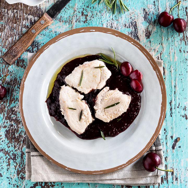Ingredienti: gr. 200 di ciliegie, gr. 100 di aceto balsamico, 8 fette di petto di pollo, olio, sale fino, pepe nero, rosmarino. Riscaldate l’aceto in un pentolino, aggiungete, con il sale e con il pepe, le ciliegie denocciolate e tagliate in pezzi, mescolate con cautela in modo dar far ammorbidire le ciliegie e rapprendere il composto, che diventerà fluido e omogeneo con l’aiuto di un frullatore. Intanto, fate cuocere le fette di pollo in una padella, con l’acqua, il sale e il pepe nero. Quando la cottura del pollo è completata, spalmate sul fondo dei piatti la salsa di ciliegie, adagiate su di essa le fette di pollo, condite con un filo di olio a crudo e, se volete, con il rosmarino, e portate in tavola. (www. giallo zafferano).