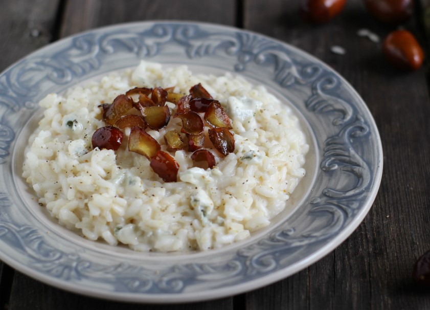 Ingredienti: gr.320 di riso, 1 scalogno, gr.80 di burro, ml 150 di vino bianco, ml 900 di gorgonzola, 20 giuggiole, sale. In una pentola fate sciogliere il burro lentamente, aggiungete lo scalogno affettato finemente e fatelo rosolare. Unite il riso e fatelo soffriggere per circa un minuto. Versate il vino bianco, mescolate e fate sfumare, e subito dopo versate un po’ di brodo vegetale, salate e fate cuocere aggiungendo progressivamente altro brodo fino all’ultima cottura. Tagliate a tocchetti le giuggiole, eliminando il nocciolo sottile e pungente, e poi fatele saltare in padella con il burro in modo che risultino lievemente caramellate. Tagliate il gorgonzola a pezzetti, e un paio di minuti prima della cottura finale aggiungete i pezzetti al risotto e mescolate bene. Impiattate, distribuite giuggiole sulla superfice e servite. (Immagine del piatto e testo dal sito “GialloZafferano”).