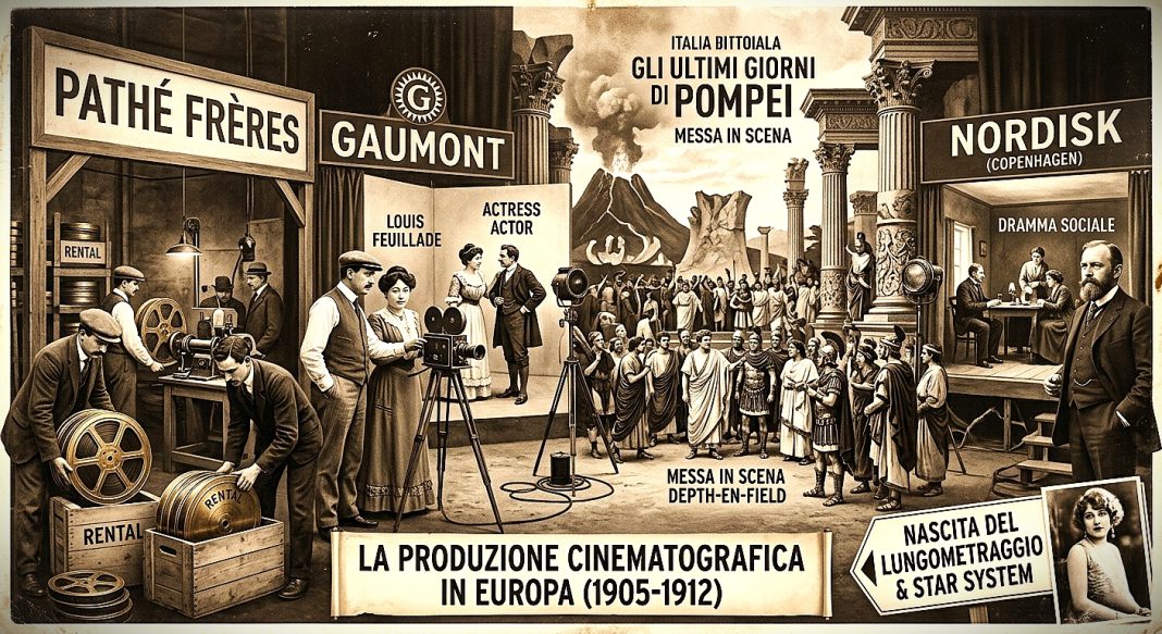 In questo periodo la Francia domina il mercato mondiale grazie a due colossi in competizione: la Pathé Frères e la Gaumont. La Pathé si distingue per un’integrazione verticale che comprende la produzione di pellicole, macchine da presa e la gestione di sale proprie. Per ottimizzare i profitti, l’azienda introduce il sistema del noleggio dei film ai gestori delle sale invece della vendita diretta, garantendo entrate costanti e un controllo maggiore sulla distribuzione. La Gaumont, sebbene più piccola, segue un modello simile costruendo nuovi studi di posa e affidando la produzione a registi di rilievo come Alice Guy e successivamente Louis Feuillade, che spaziano tra commedie, drammi e film storici.