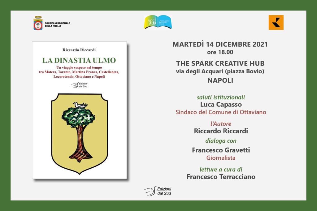 Martedì 14 dicembre, alle ore 18, nella libreria “The Spark Creative Hub”, via degli Acquari (piazza Bovio) di Napoli, sarà presentato il saggio di Riccardo Riccardi “LA DINASTIA ULMO – Un viaggio sospeso nel tempo tra Matera, Taranto, Martina Franca, Castellaneta, Ottaviano e Napoli” (Edizione dal Sud); un evento culturale in collaborazione con l’associazione “A Voce Alta” e patrocinato dal Consiglio Regionale della Puglia e dalla casa editrice “Edizioni dal Sud”.